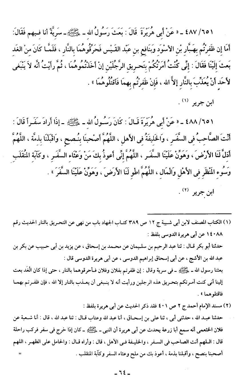 651/ 487 - "عَنْ أَبِي هُرَيْرَةَ قَالَ: بَعَثَ رَسُولُ اللهِ - صلى الله عليه وسلم - سَرِيَّةً أنا فِيهم فَقَالَ: أَمَا إِن ظَفِرْتُم بِهَبَّارِ بْنِ الأسْوَدِ وَبنَافِعِ بنِ عَبْد القَيْس فَحَرِّقُوهُمَا بِالنَّارِ، فَلَمَّا كَانَ مِنْ الغَدِ بَعثَ إِلَيْنَا فَقَالَ: إِنِّي كُنْتُ أَمَرْتُكُمْ بِتَحرِيقِ الرَّجُلَيْنِ إنْ أَخَذْتُمُوهُمَا، ثُمَّ رأَيْتُ أنَّه لَا يَنْبَغي لأَحَدٍ أَنْ يُعَذِّبَ بِالنَّارِ إلَّا الله، فَإِنْ ظَفِرْتُم بِهمَا فَأقتُلُوهُمَا".