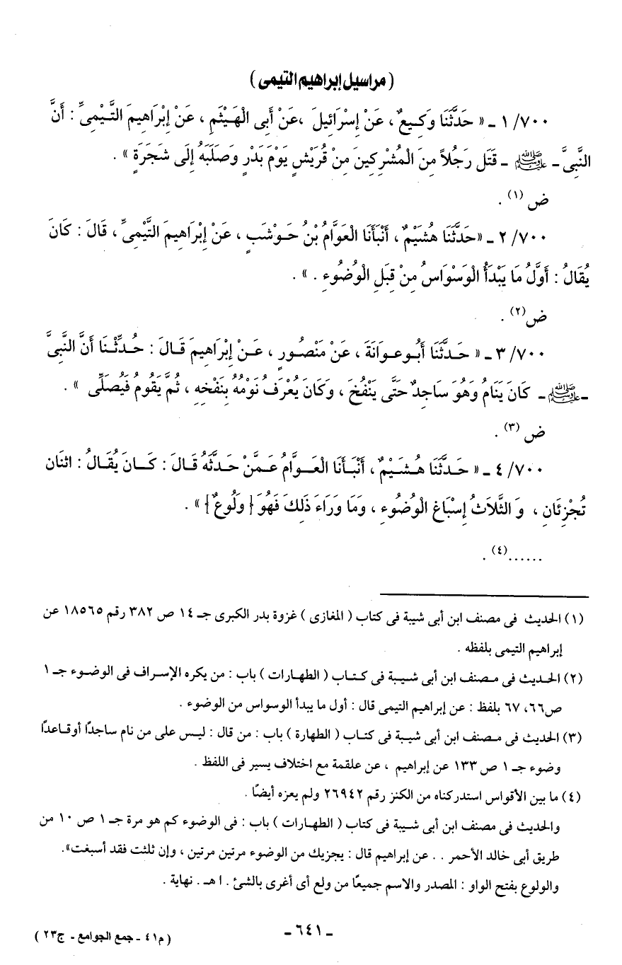 700/ 1 - " حَدَّثَنَا وَكيعٌ، عَنْ إِسْرَائِيلَ، عَنْ أَبِى الْهَيْثَمِ، عَنْ إِبْرَاهِيمَ التَّيْمِىِّ: أَنَّ النَّبِىَّ -صلى اللَّه عليه وسلم- قَتَل رَجُلًا مِنَ الْمُشْرِكِينَ مِنْ قُرَيْشٍ يَوْمَ بَدْرٍ وَصَلَبَهُ إِلَى شَجَرَةٍ".