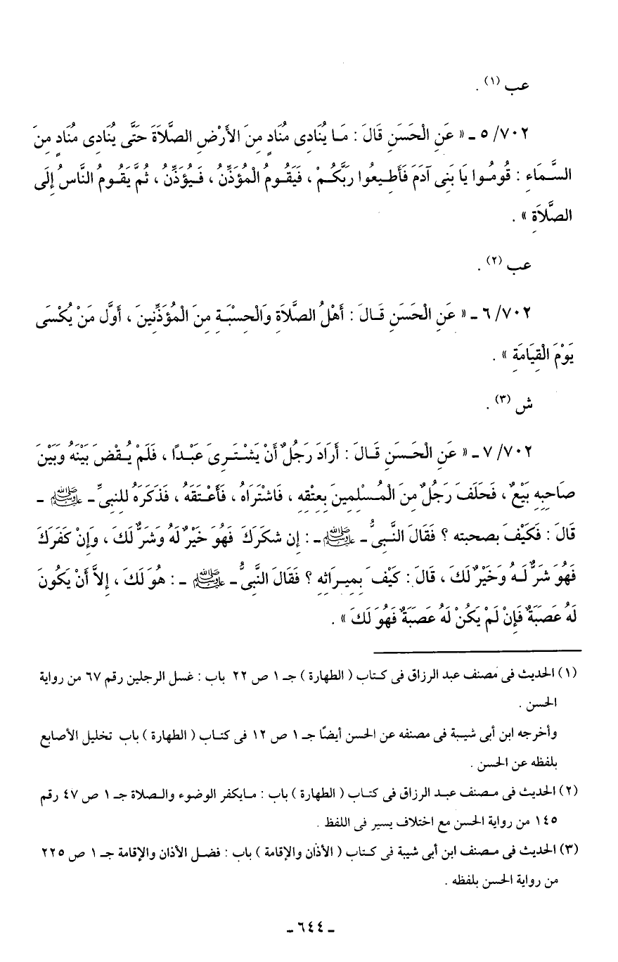 702/ 6 - "عَنِ الْحَسَنِ قَالَ: أَهْلُ الصَّلَاةِ وَالْحِسْبَةِ مِنَ الْمُؤَذِّنِينَ، أَوَّل مَنْ يُكْسَى يَوْمَ الْقِيَامَةِ".