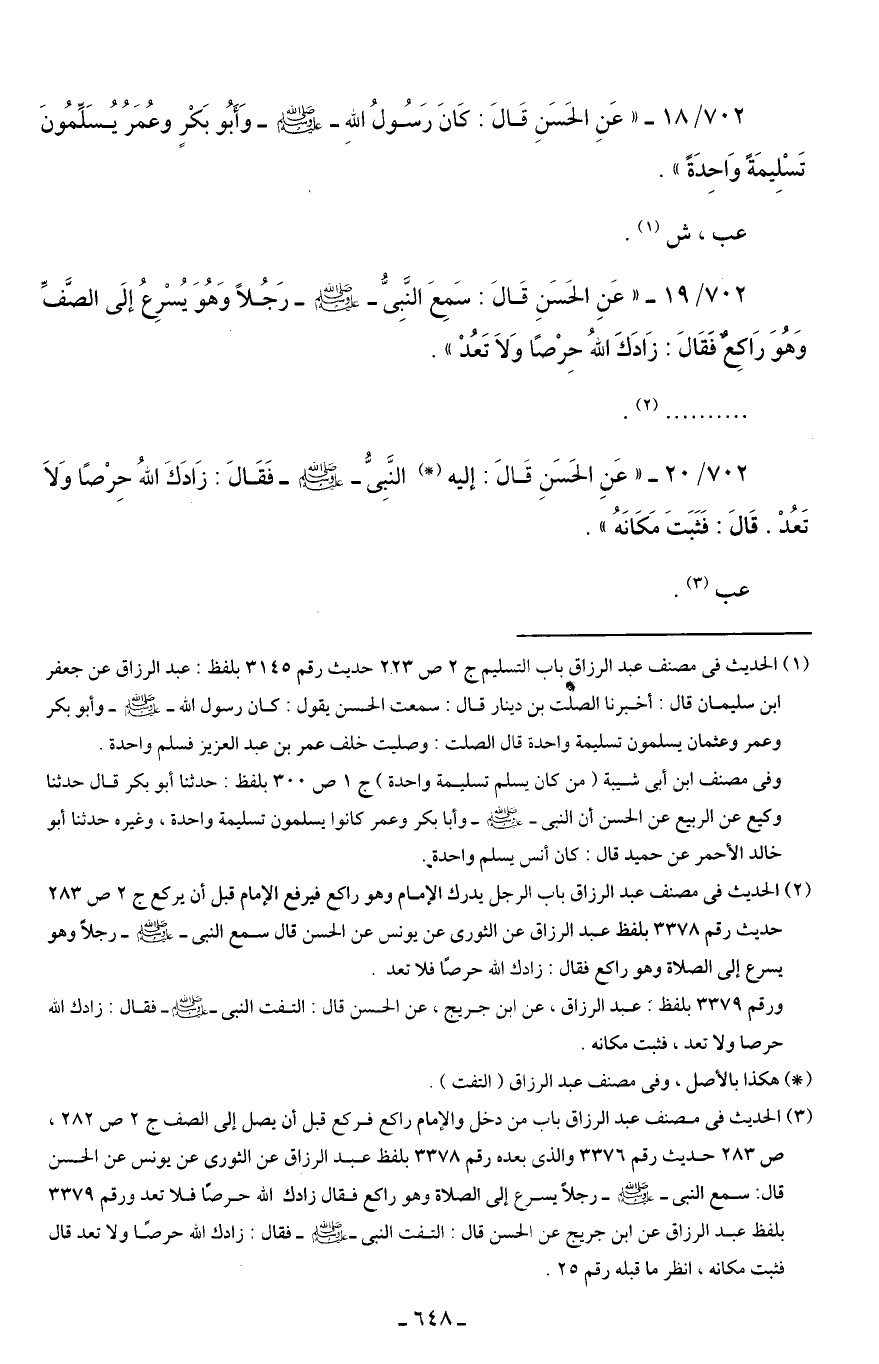 702/ 18 - "عَنِ الحَسَنِ قَالَ: كَانَ رَسُولُ اللَّهِ -صلى اللَّه عليه وسلم- وَأَبُو بَكْرٍ وعُمَرُ يُسَلِّمُونَ تَسْلِيمَةً وَاحِدَةً".