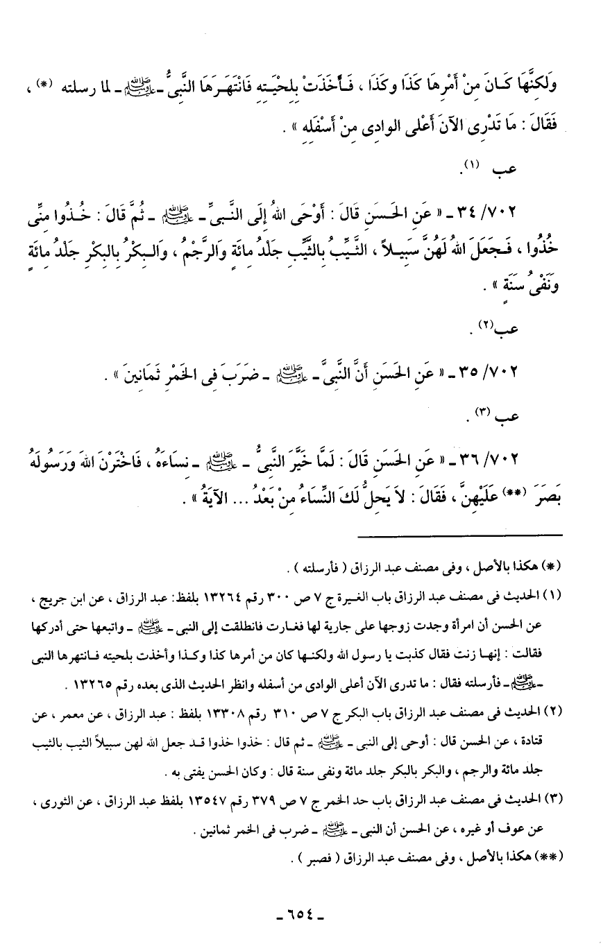 702/ 34 - "عَنِ الحَسَنِ قَالَ: أَوْحَى اللَّهُ إِلَى النَّبىِّ -صلى اللَّه عليه وسلم- ثُمَّ قَالَ: خُذُوا مِنِّى خُذُوا، فَجَعَلَ اللَّهُ لَهُنَّ سَبِيلًا، الثَّيِّبُ بِالثَّيِّبِ جَلْدُ مِائَةٍ وَالرَّجْمُ، وَالبِكْرُ بِالبِكْرِ جَلْدُ مِائَةٍ وَنَفْىُ سَنَةٍ".