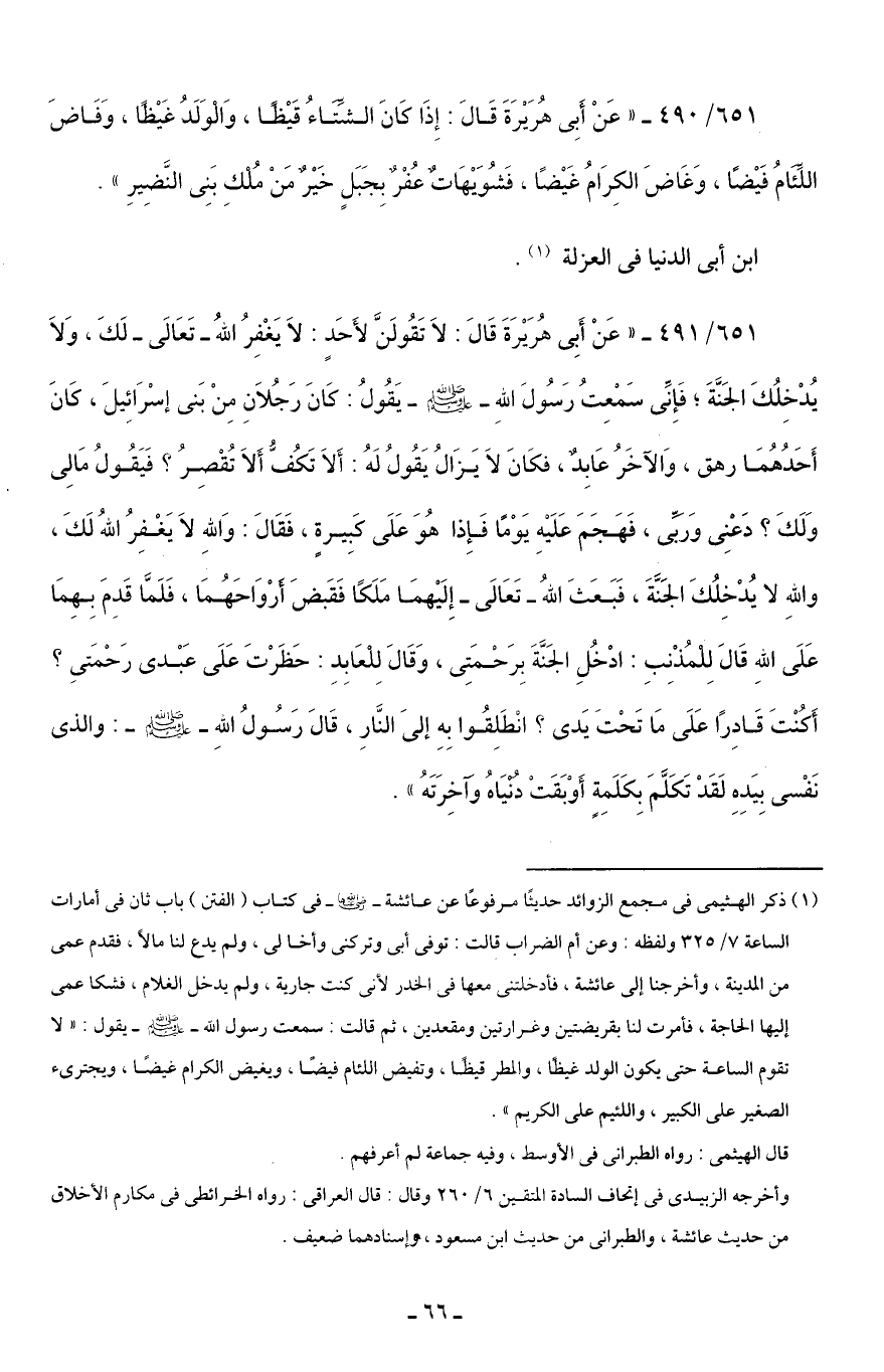 651/ 491 - "عَنْ أَبِي هُرَيْرَةَ قَالَ: لاَ تَقُولَنَّ لأَحَدٍ: لاَ يَغْفِرُ اللهُ - تَعَالَى- لَكَ، وَلَا يُدْخِلُكَ الجَنَّةَ؛ فَإِنِّي سَمْعِتُ رَسُولَ اللهِ - صلى الله عليه وسلم - يَقُولُ: كَانَ رَجُلَانِ مِنْ بَني إسْرَائِيلَ، كَانَ أَحَدُهُمَا رهق، وَالآخَرُ عَابِدٌ، فكَانَ لاَ يَزَالُ يَقُولُ لَهُ: أَلَا تَكُفُّ أَلَا تُقْصِرُ؟ فَيَقُولُ مَالِي وَلَكَ؟ دَعْنِي وَربِّي، فَهَجَمَ عَلَيْهِ يَوْمًا فَإِذا هُوَ عَلَى كَبِيرةٍ، فَقَالَ: وَاللهِ لاَ يَغْفِرُ اللهُ لَكَ، واللهِ لا يُدْخِلُكَ الجَنَّةَ، فَبَعَثَ اللهُ - تَعَالَى- إِلَيْهمَا مَلَكًا فَقَبضَ أَرْوَاحَهُمَا، فَلَمَّا قَدِمَ بِهِمَا عَلَى اللهِ قَالَ لِلْمُذْنِبِ: ادْخُلِ الجَنَّةَ بِرَحْمَتِي، وَقَالَ لِلْعَابِدِ: حَظَرْتَ عَلَى عَبْدي رَحْمَتي؟ أَكُنْتَ قَادِرًا عَلَى مَا تَحْتَ يَدي؟ انْطَلِقُوا بِهِ إلىَ النَّارِ، قَالَ رَسُولُ اللهِ - صلى الله عليه وسلم -: والذي نَفْسي بِيَدِهِ لَقَدْ تَكَلَّمَ بِكَلَمِةٍ أَوْبَقَتْ دُنْيَاهُ وآخِرَتَهُ".