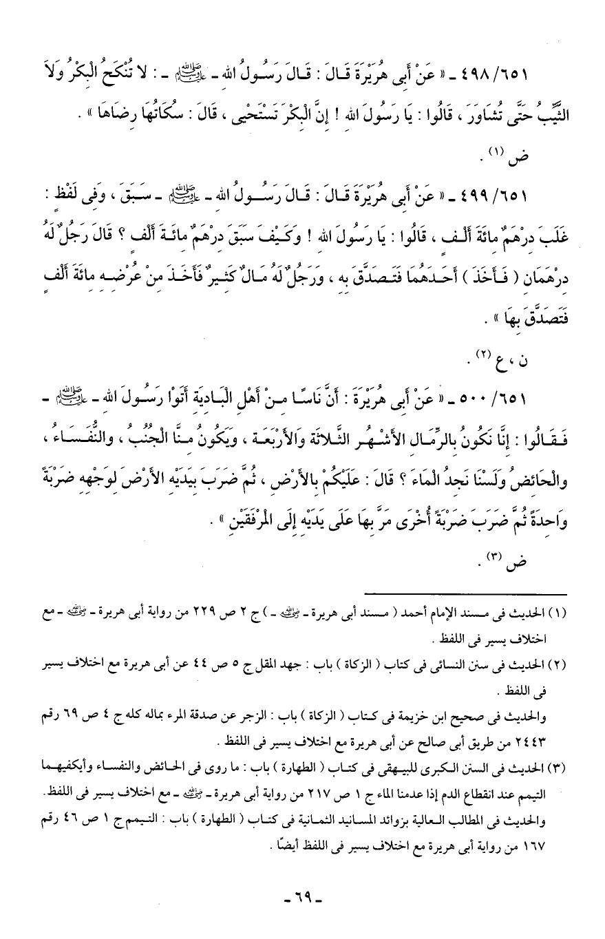 651/ 500 - "عَنْ أَبِي هُرَيْرَةَ: أَنَّ نَاسًا مِنْ أَهْلِ الْبَادِيَةِ أَتَوْا رَسُولَ اللهِ - صلى الله عليه وسلم - فَقَالُوا: إِنَّا نَكُونُ بِالرِّمَالِ الأَشْهُر الثَّلاثَة وَالأَرْبَعَة، وَيَكُونُ مِنَّا الْجُنُبُ، والنُّفَسَاءُ، والْحَائِضُ وَلَسْنَا نَجِدُ الْمَاءَ؟ قَالَ: عَلَيْكُمْ بِالأَرْضِ، ثُمَّ ضَرَبَ بِيَدَيْهِ الأَرْضَ لِوَجْهِهِ ضَرْبَةً وَاحِدَةً ثُمَّ ضَرَبَ ضَرْبَةً أُخْرَى مَرَّ بِهَا عَلَى يَدَيْهِ إِلَى الْمرْفَقَيْنِ".