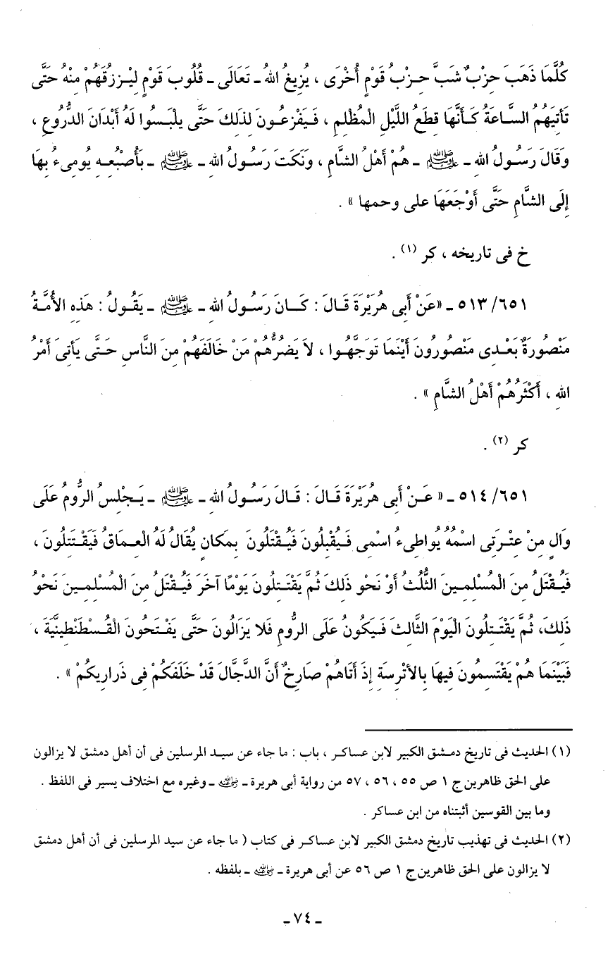 (¬2) الحديث في تهذيب تاريخ دمشق الكبير لابن عساكر في كتاب (ما جاء عن سيد المرسلين في أن أهل دمشق لا يزالون على الحق ظاهرين ج 1 ص 56 عن أبي هريرة - رضي الله عنه - بلفظه.