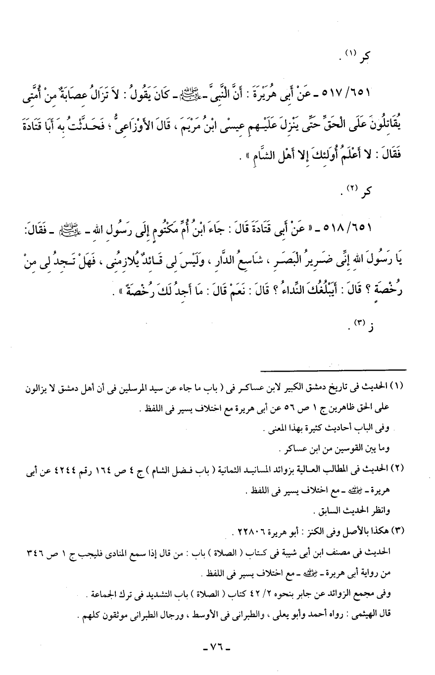 651/ 517 - عَنْ أَبِي هُرَيْرَةَ: أَنَّ الْنَّبِيَّ - صلى الله عليه وسلم - كَانَ يَقُولُ: لَا تَزَالُ عِصَابَةٌ مِنْ أُمَّتِي يُقَاتِلُونَ عَلَى الْحَقِّ حتَّى يَنْزِلَ عَلَيْهم عِيسْى ابْنُ مَرْيَمَ، قَالَ الأَوْزَاعِيُّ؛ فَحَدَّثْتُ بِهَ أَبَا قَتَادَةَ فَقَالَ: لا أَعْلَمُ أُوَلئِكَ إِلا أَهْل الشَّامِ".