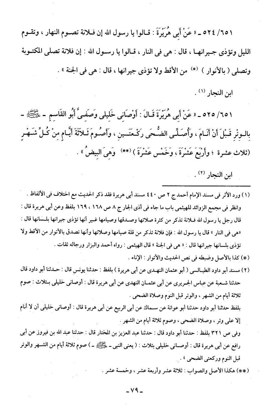 651/ 525 - "عَنْ أَبِي هُرَيْرَةَ قَالَ: أَوْصَانِي خَلِيلي وَصَفِيَّ أَبُو القَاسِمِ - صلى الله عليه وسلم - بِالوِتْرِ قَبْلَ أَنْ أَنَامَ، وَأُصَلِّي الضُّحَى رَكْعَتَينِ، وَأَصُومَ ثَلَاثَةَ أَيَّامٍ مِنْ كُلِّ شَهْرٍ (ثلاث عشرة؛ وأَرْبَعَ عَشْرَةَ، وَخَمْس عَشْرَةَ) (* *) وَهِيَ البِيضُ".