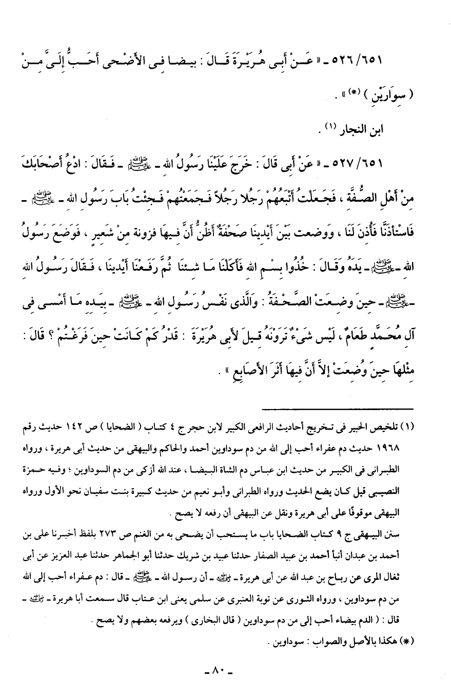 (¬1) تلخيص الحبير في تخريج أحاديث الرافعي الكبير لابن حجر ج 4 كتاب (الضحايا) ص 142 حديث رقم 1968 حديث دم عفراء أحب إلى الله من دم سوداوين أحمد والحاكم والبيهقي من حديث أبي هريرة، ورواه الطبراني في الكبير من حديث ابن عباس دم الشاة البيضا، عند الله أزكى من دم السوداوين؛ وفيه حمزة النصيبي قيل كان يضع الحديث ورواه الطبراني وأبو نعيم من حديث كبيرة بنت سفيان نحو الأول ورواه البيهقي موقوفًا على أبي هريرة ونقل عن البيهقي أن رفعه لا يصح.