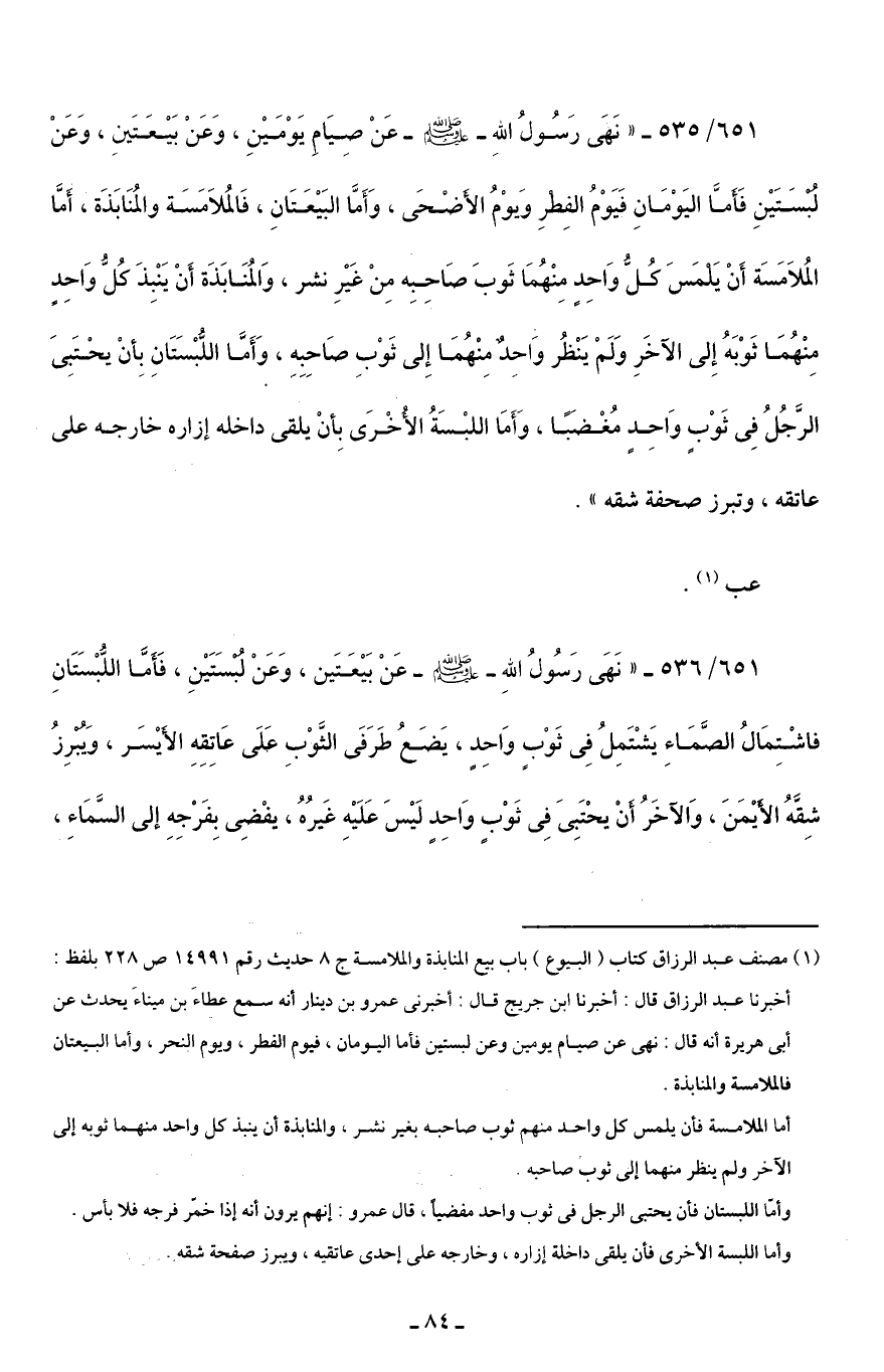 651/ 535 - "نَهَى رَسُولُ الله - صلى الله عليه وسلم - عَنْ صِيَامِ يَوْمَيْنِ، وَعَنْ بَيْعَتَينِ، وَعَنْ لُبْسَتَيْنِ فَأَمَّا اليَوْمَانِ فَيَوْمُ الفِطْرِ وَيوْمُ الأَضْحَى، وَأَمَّا البَيْعَتَانِ، فَالمُلاَمَسَة والمُنَابَذَة، أَمَّا المُلاَمَسَة أَنْ يَلْمَسَ كُلُّ وَاحِدٍ مِنْهُمَا ثَوبَ صَاحِبِه مِنْ غَيْرِ نشر، وَالمُنَابَذَة أَنْ يَنْبِذَ كُلُّ وَاحِدٍ مِنْهُمَا ثَوْبَهُ إِلى الآخَرِ وَلَمْ يَنْظُر وَاحِدٌ مِنْهُمَا إِلى ثَوْبِ صَاحِبِهِ، وَأَمَّا اللُّبْسَتَانِ بِأنْ يحْتَبِيَ الرَّجُلُ فِي ثَوْبٍ وَاحِدٍ مُغْضَبًا، وَأَمَا اللبْسَةُ الأُخْرَى بِأنْ يلقى داخله إزاره خارجه على عاتقه، وتبرز صحفة شقه".