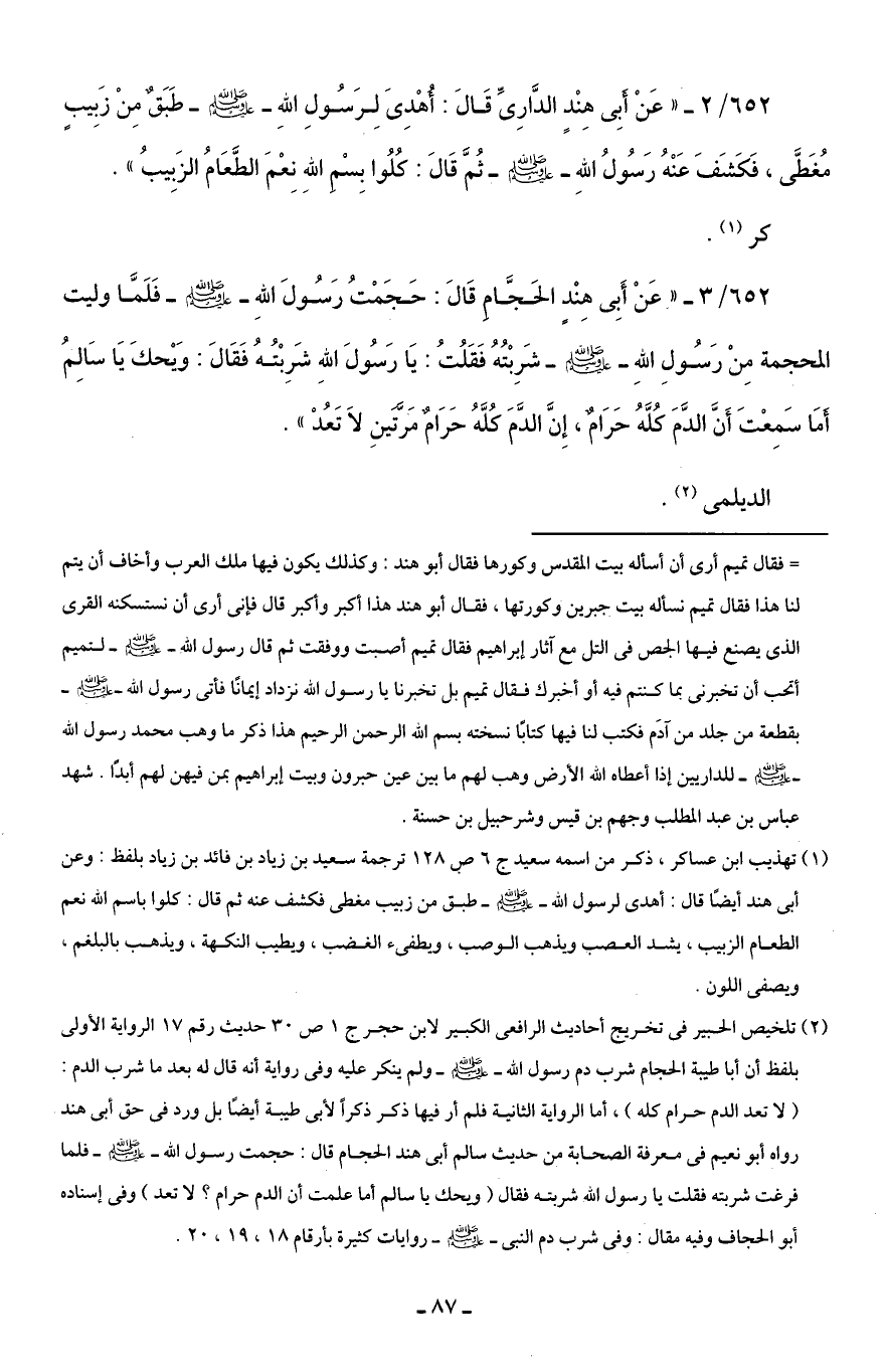 (¬2) تلخيص الحبير في تخريج أحاديث الرافعي الكبير لابن حجر ج 1 ص 30 حديت رقم 17 الرواية الأولى بلفظ أن أبا طيبة الحجام شرب دم رسول الله - صلى الله عليه وسلم - ولم ينكر عليه وفي رواية أنه قال له بعد ما شرب الدم: (لا تعد الدم حرام كله)، أما الرواية الثانية فلم أر فيها ذكر ذكرًا لأبي طيبة أيضًا بل ورد في حق أبي هند رواه أبو نعيم في معرفة الصحابة من حديث سالم أبي هند الحجام قال: حجمت رسول الله - صلى الله عليه وسلم - فلما فرغت شربته فقلت يا رسول الله شربته فقال (ويحك يا سالم أما علمت أن الدم حرام؟ لا تعد) وفي إسناده أبو الحجاف وفيه مقال: وفي شرب دم النبي - صلى الله عليه وسلم - روايات كثيرة بأرقام 18، 19، 20.