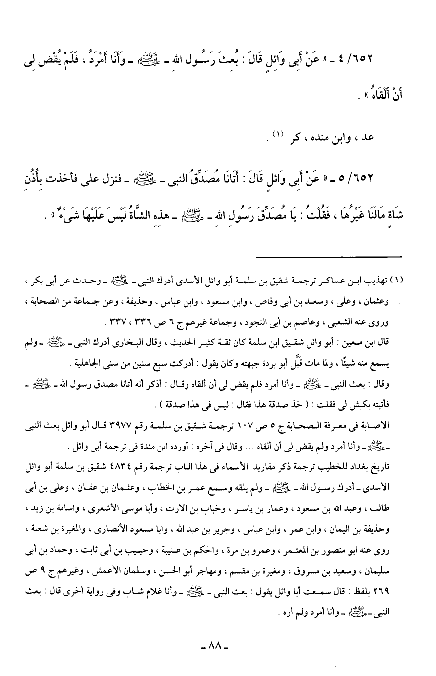 652/ 4 - "عَنْ أَبِي وَائِلٍ قَالَ: بُعِثَ رَسُول اللهِ - صلى الله عليه وسلم - وَأَنَا أَمْرَدُ، فَلَمْ يُقْض لِي أَنْ أَلْقَاهُ".