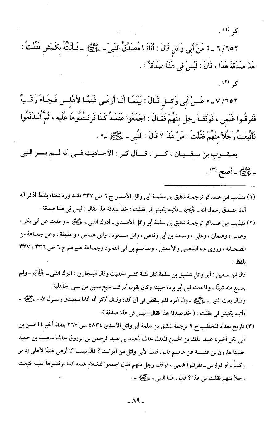 652/ 6 - "عَنْ أَبِي وَائلٍ قَالَ: أَتَانَا مُصَدِّقُ النَبيّ - صلى الله عليه وسلم - فَأَتَيْتُهُ بِكَبْشٍ فَقُلْتُ: خُذْ صَدَقةَ هَذَا، قَالَ: لَيْسَ فِي هَذَا صَدَقةٌ".