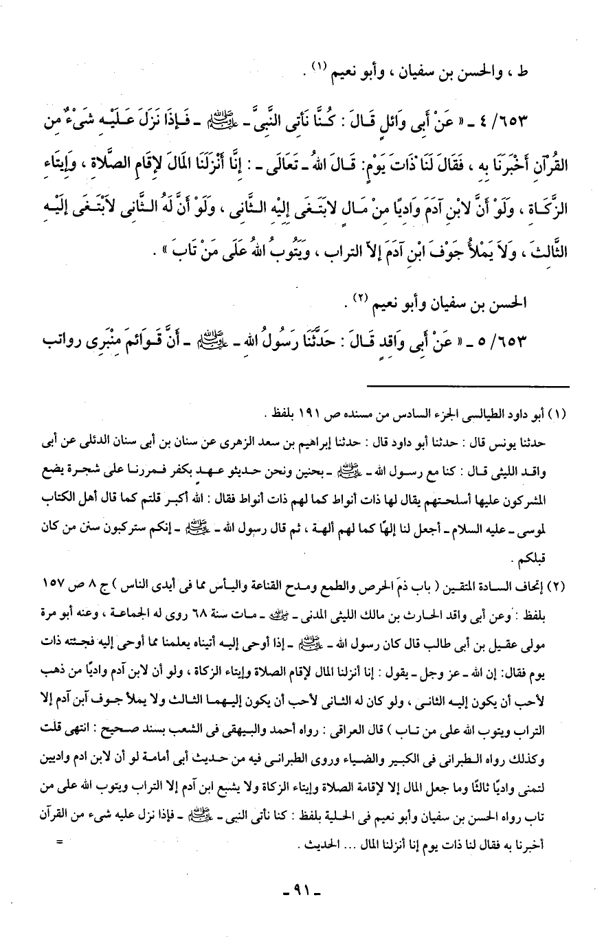 653/ 4 - "عَنْ أَبِي وَائلٍ قَالَ: كُنَّا نَأتِي النَبِيَّ - صلى الله عليه وسلم - فَإذَا نَزَلَ عَلَيْهِ شَيْءٌ مِن القُرْآنِ أَخْبَرَنَا بِهِ، فَقَالَ لَنَا ذَاتَ يَوْمٍ: قَالَ اللهُ - تَعَالَى-: إِنَّا أَنْزَلَنَا المَالَ لإِقَامِ الصَّلاةِ، وَإِيتَاءِ الزَّكَاةِ، وَلَوْ أَنَّ لابْنِ آدَمَ وَادِيًا مِنْ مَالٍ لابَتَغَى إِلِيْهِ الثَّانِي، وَلَوْ أَنَّ لَهُ الثَّانِي لاَبْتَغَى إلَيْهِ الثَّالِثَ، وَلَا يَمْلأُ جَوْفَ ابْنِ آدَمَ إلَّا التراب، وَيَتُوبُ اللهُ عَلَى مَنْ تَابَ".
