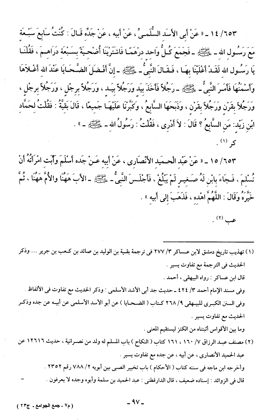 653/ 14 - "عَنْ أَبِي الأَسَدِ السُّلَميِّ، عَنْ أَبيه، عَنْ جَدِّهِ قَالَ: كُنْتُ سَابِعَ سَبْعَةٍ مَعَ رَسُولِ اللهِ - صلى الله عليه وسلم - فَجَمَعَ كُلُّ وَاحِدٍ دِرْهَمًا فَاشَتَرْيَنَا أُضْحِيَةً بِسَبْعَةِ دَرَاهِمَ، فَقُلْنَا يَا رَسُول اللهِ لَقَدْ أَغْلَيْنَا بِهَا، فَقَالَ النَّبِيُّ - صلى الله عليه وسلم - إِنَّ أَفْضَلَ الضَّحَايَا عَنْدَ اللهِ أَغْلَاهَا وَأَسْمَنُهَا فَأَمَرَ النَّبِيُّ - صلى الله عليه وسلم - رَجُلًا فأَخَذَ بِيَدٍ وَرَجُلًا بِيَدٍ، وَرَجُلًا بِرِجْلٍ، وَرَجُلًا بِرجْلٍ، وَرَجُلًا بِقَرْنٍ وَرَجُلًا بِقَرْنٍ، وَذَبَحَهَا السَّابِعُ، وَكَبَّرْنَا عَلَيْهَا جَمِيعًا، قَالَ بَقِيَّةُ: فَقُلْتُ لِحَمَّادِ ابْنِ زَيْدٍ: مَنِ السَّابِعُ؟ قَالَ: لَا أَدْرِي، فَقُلْتُ: رَسُولُ اللهِ - صلى الله عليه وسلم -".