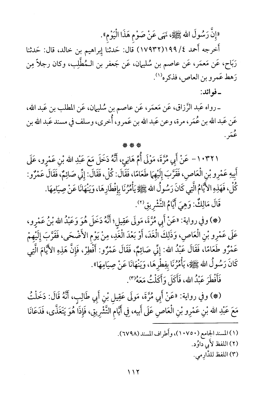 ١٠٣٢١ - عن أبي مرة مولى أم هانئ، أنه دخل مع عبد الله بن عَمرو، على أبيه عَمرو بن العاص، فقرب إليهما طعاما، فقال: كل، فقال: إني صائم، فقال عَمرو: كل، فهذه الأيام التي كان رسول الله صَلى الله عَليه وسَلم يأمرنا بإفطارها، وينهانا عن صيامها.