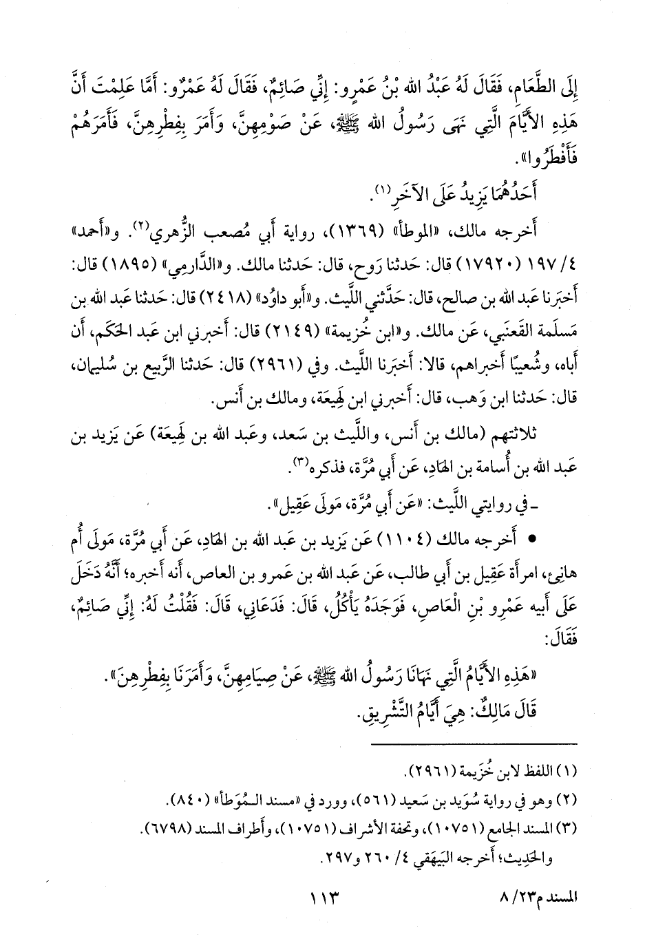 • أَخرجه مالك (١١٠٤) عن يزيد بن عبد الله بن الهاد، عن أبي مرة مولى أم هانئ، امرأة عقيل بن أبي طالب، عن عبد الله بن عَمرو بن العاص، أنه أخبره؛ أنه دخل على أبيه عَمرو بن العاص، فوجده يأكل، قال: فدعاني، قال: فقلت له: إني صائم، فقال: