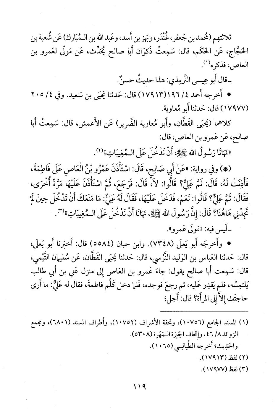 - وفي رواية: «عن أبي صالح، قال: استأذن عَمرو بن العاص على فاطمة، فأذنت له، قال: ثم علي؟ قالوا: لا، قال: فرجع، ثم استأذن عليها مرة أخرى، فقال: ثم علي؟ قالوا: نعم، فدخل عليها، فقال له علي: ما منعك أن تدخل حين لم تجدني هاهنا؟ قال: إن رسول الله صَلى الله عَليه وسَلم نهانا أن ندخل على المُغِيبَات» (¬٢).