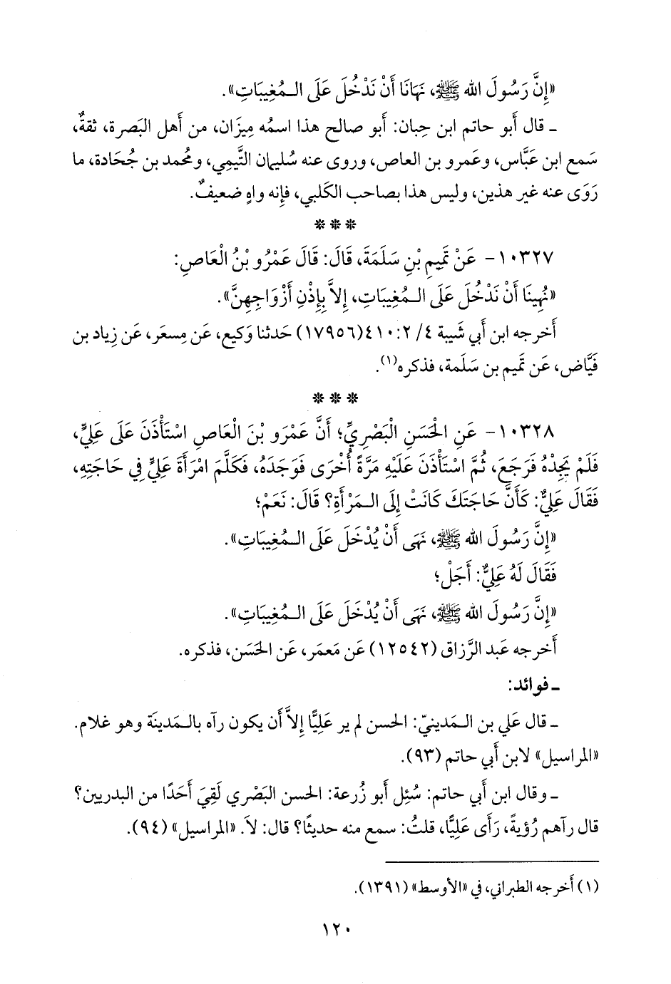 ١٠٣٢٨ - عن الحسن البصري؛ أن عَمرو بن العاص استأذن على علي، فلم يجده فرجع، ثم استأذن عليه مرة أخرى فوجده، فكلم امرأة علي في حاجته، فقال علي: كأن حاجتك كانت إلى المرأة؟ قال: نعم؛