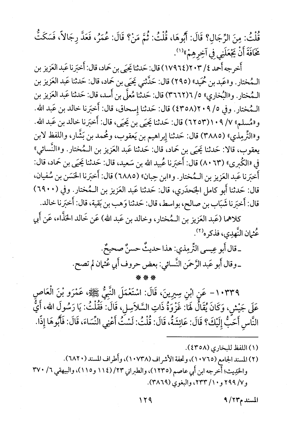 ١٠٣٣٩ - عن ابن سِيرين، قال: استعمل النبي صَلى الله عَليه وسَلم عَمرو بن العاص على جيش، وكان يقال لها: غزوة ذات السلاسل، قال: فقلت: يا رسول الله، أي الناس أحب إليك؟ قال: عائشة، قال: قلت: لست أعني النساء، قال: فأَبوها إذا.