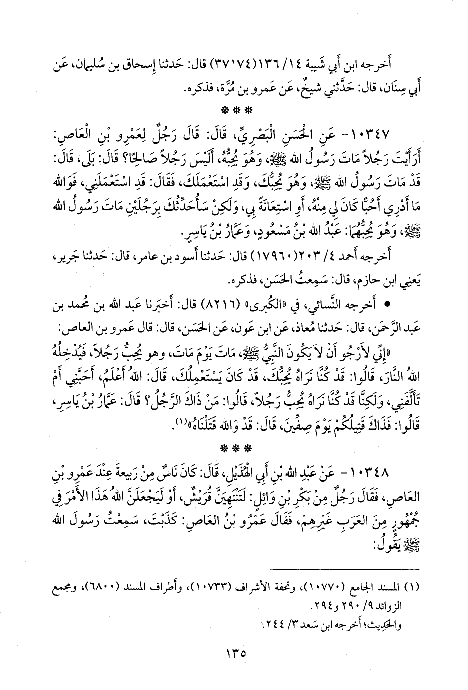 • أَخرجه النَّسَائي في «الكبرى» (٨٢١٦) قال: أخبرنا عبد الله بن محمد بن عبد الرَّحمَن، قال: حدثنا معاذ، عن ابن عَون، عن الحسن، قال: قال عَمرو بن العاص: