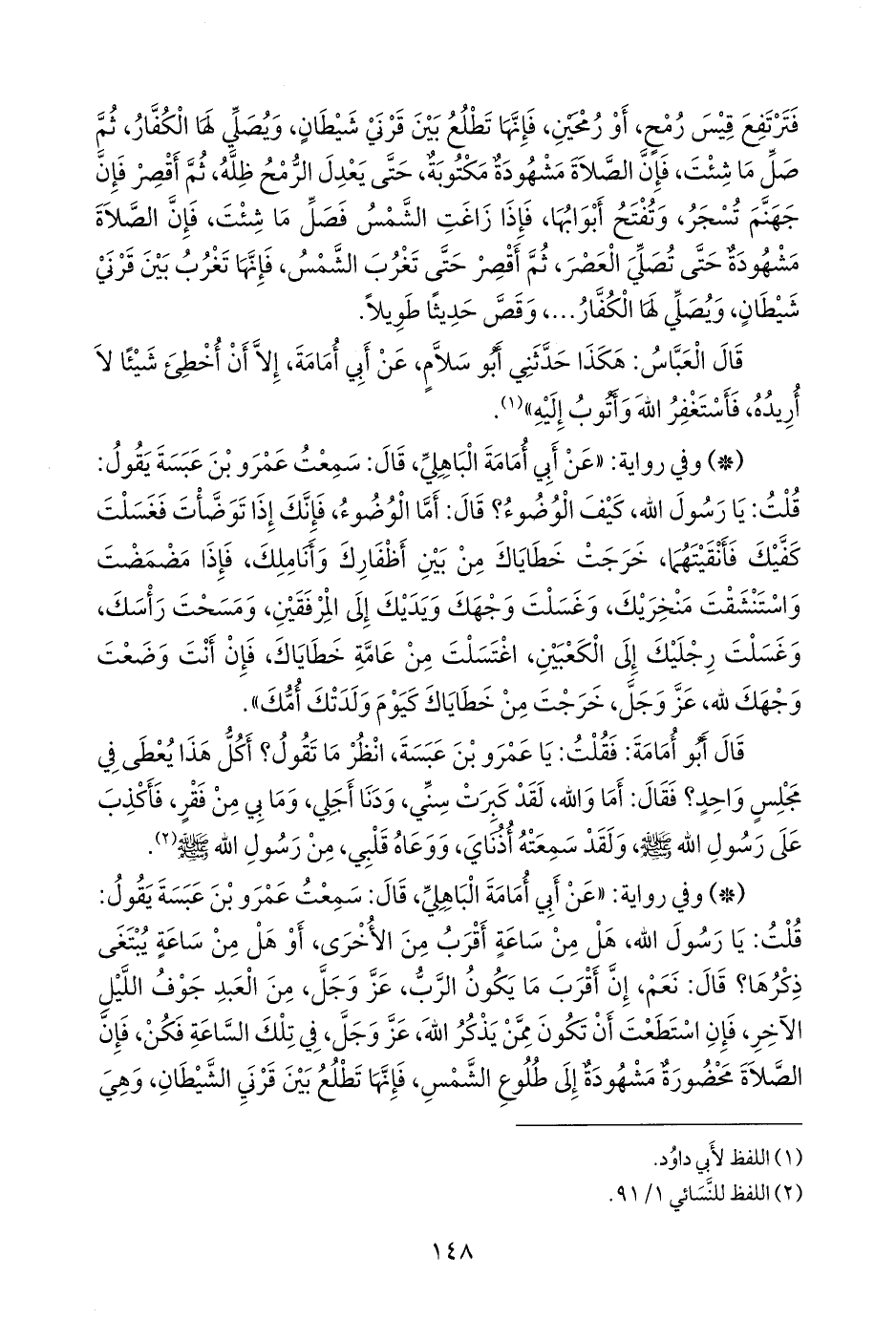 - وفي رواية: «عن أَبي أُمامة الباهلي، قال: سمعت عَمرو بن عبسة يقول: قلت: يا رسول الله، هل من ساعة أقرب من الأخرى، أو هل من ساعة يبتغى ذكرها؟ قال: نعم، إن أقرب ما يكون الرب، عز وجل، من العبد جوف الليل الآخر، فإن استطعت أن تكون ممن يذكر الله، عز وجل، في تلك الساعة فكن، فإن الصلاة محضورة مشهودة إلى طلوع الشمس، فإنها تطلع بين قرني الشيطان، وهي