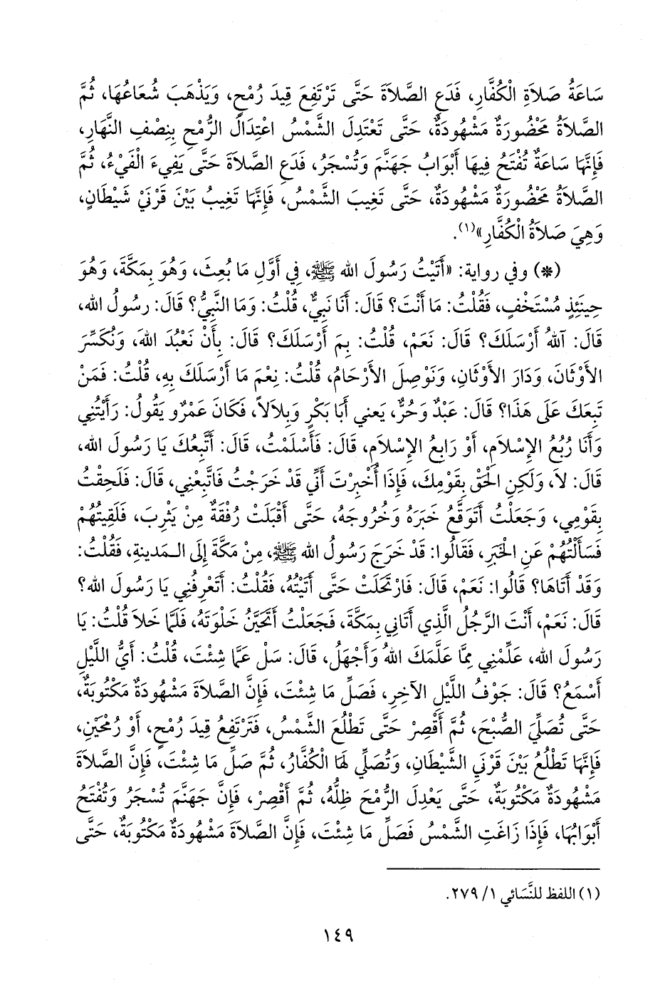 - وفي رواية: «أتيت رسول الله صَلى الله عَليه وسَلم في أول ما بعث، وهو بمكة، وهو حينئذ مستخف، فقلت: ما أنت؟ قال: أنا نبي، قلت: وما النبي؟ قال: رسول الله، قال: آلله أرسلك؟ قال: نعم، قلت: بم أرسلك؟ قال: بأن نعبد الله، ونكسر الأوثان، ودار الأوثان، ونوصل الأرحام، قلت: نعم ما أرسلك به، قلت: فمن تبعك على هذا؟ قال: عبد وحر، يعني أبا بكر وبلالا، فكان عَمرو يقول: رأيتني وأنا ربع الإسلام، أو رابع الإسلام، قال: فأسلمت، قال: أتبعك يا رسول الله، قال: لا، ولكن الحق بقومك، فإذا أخبرت أني قد خرجت فاتبعني، قال: فلحقت بقومي، وجعلت أتوقع خبره وخروجه، حتى أقبلت رفقة من يثرب، فلقيتهم فسألتهم عن الخبر، فقالوا: قد خرج رسول الله صَلى الله عَليه وسَلم من مكة إلى المدينة، فقلت: وقد أتاها؟ قالوا: نعم، قال: فارتحلت حتى أتيته، فقلت: أتعرفني يا رسول الله؟ قال: نعم، أنت الرجل الذي أتاني بمكة، فجعلت أتحين خلوته، فلما خلا قلت: يا رسول الله، علمني مما علمك الله وأجهل، قال: سل عما شئت، قلت: أي الليل أسمع؟ قال: جوف الليل الآخر، فصل ما شئت، فإن الصلاة مشهودة مكتوبة، حتى تصلي الصبح، ثم أقصر حتى تطلع الشمس، فترتفع قيد رمح، أو رمحين، فإنها تطلع بين قرني الشيطان، وتصلي لها الكفار، ثم صل ما شئت، فإن الصلاة مشهودة مكتوبة، حتى يعدل الرمح ظله، ثم أقصر، فإن جهنم تسجر وتفتح أَبوابها، فإذا زاغت الشمس فصل ما شئت، فإن الصلاة مشهودة مكتوبة، حتى
