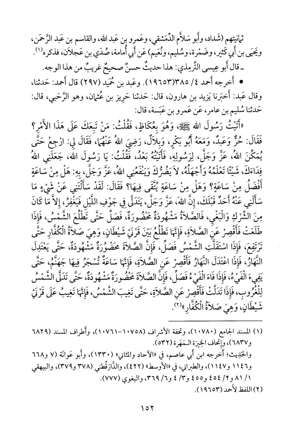 «أتيت رسول الله صَلى الله عَليه وسَلم وهو بعكاظ، فقلت: من تبعك على هذا الأمر؟ فقال: حر وعبد، ومعه أَبو بكر، وبلال، رضي الله عنهما، فقال لي: ارجع حتى يمكن الله، عز وجل، لرسوله، فأتيته بعد، فقلت: يا رسول الله، جعلني الله فداءك، شيئًا تعلمه وأجهله، لا يضرك وينفعني الله، عز وجل، به: هل من ساعة أفضل من ساعة؟ وهل من ساعة يتقى فيها؟ فقال: لقد سألتني عن شيء ما سألني عنه أحد قبلك، إن الله، عز وجل، يتدلى في جوف الليل فيغفر، إلا ما كان من الشرك والبغي، فالصلاة مشهودة محضورة، فصل حتى تطلع الشمس، فإذا طلعت فأقصر عن الصلاة، فإنها تطلع بين قرني شيطان، وهي صلاة الكفار حتى ترتفع، فإذا استقلت الشمس فصل، فإن الصلاة محضورة مشهودة، حتى يعتدل النهار، فإذا اعتدل النهار فأقصر عن الصلاة، فإنها ساعة تسجر فيها جهنم، حتى يفيء الفيء، فإذا فاء الفيء فصل، فإن الصلاة محضورة مشهودة، حتى تدلى الشمس للغروب، فإذا تدلت فأقصر عن الصلاة، حتى تغيب الشمس، فإنها تغيب على قرني شيطان، وهي صلاة الكفار» (¬٢).