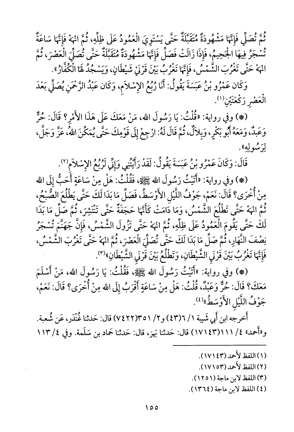 - وفي رواية: «أتيت رسول الله صَلى الله عَليه وسَلم فقلت: هل من ساعة أحب إلى الله من أخرى؟ قال: نعم، جوف الليل الأوسط، فصل ما بدا لك حتى يطلع الصبح، ثم انهه حتى تطلع الشمس، وما دامت كأنها حجفة حتى تنتشر، ثم صل ما بدا لك حتى يقوم العمود على ظله، ثم انهه حتى تزول الشمس، فإن جهنم تسجر نصف النهار، ثم صل ما بدا لك حتى تصلي العصر، ثم انهه حتى تغرب الشمس، فإنها تغرب بين قرني الشيطان، وتطلع بين قرني الشيطان» (¬٣).