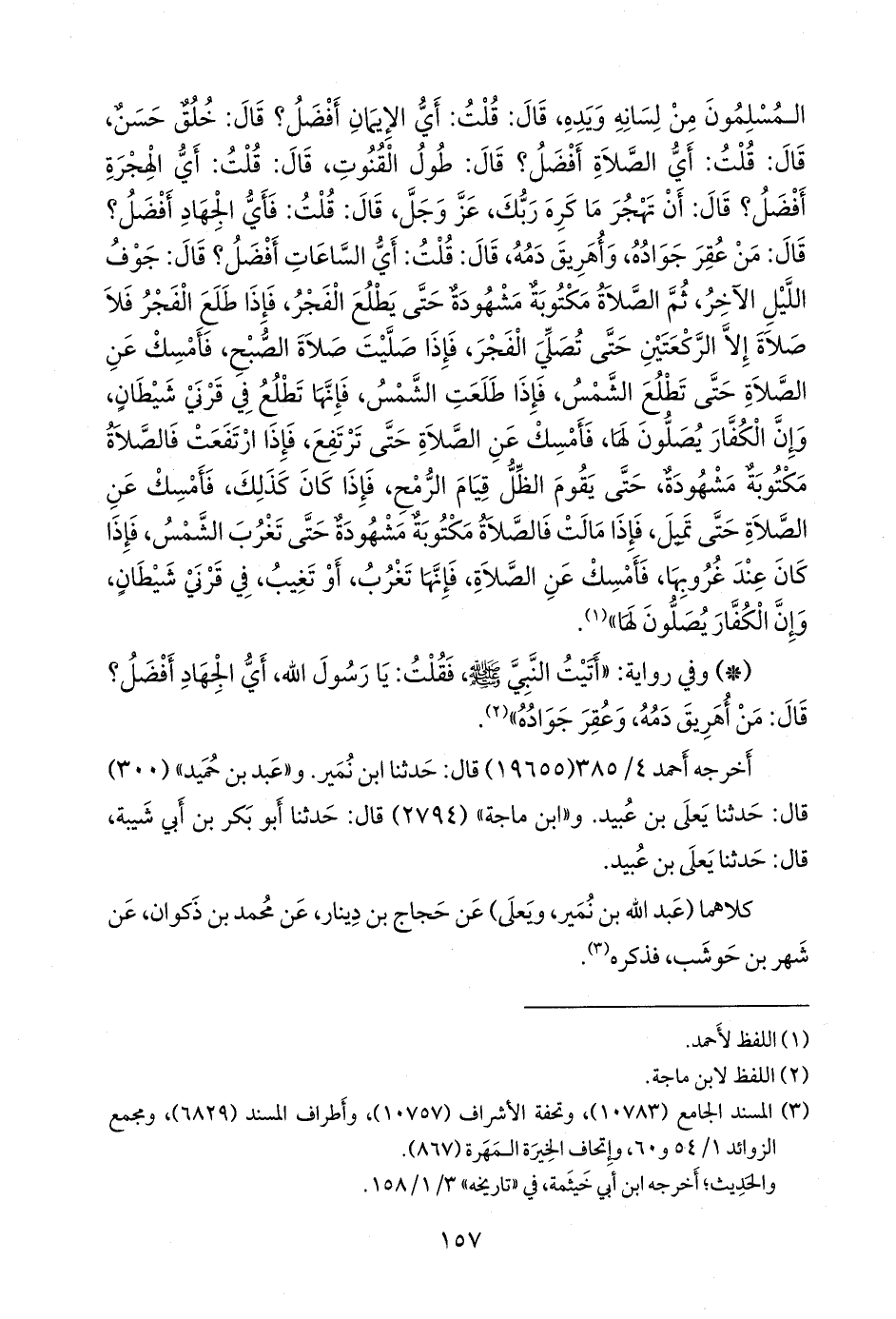 - وفي رواية: «أتيت النبي صَلى الله عَليه وسَلم فقلت: يا رسول الله، أي الجهاد أفضل؟ قال: من أهريق دمه، وعقر جواده» (¬١).
