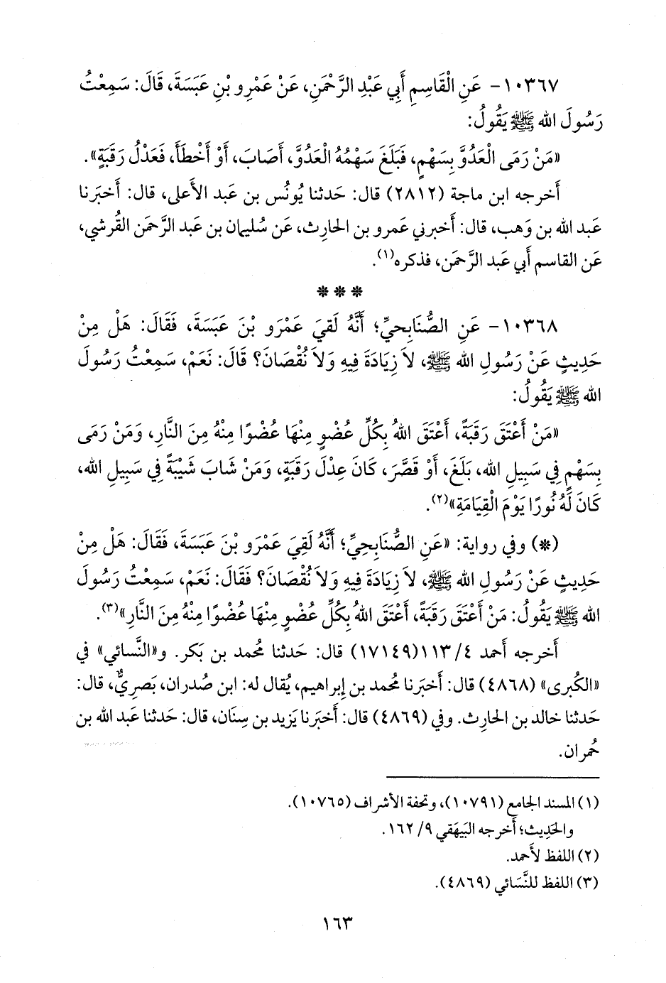- وفي رواية: «عن الصُّنَابحي؛ أنه لقي عَمرو بن عبسة، فقال: هل من حديث عن رسول الله صَلى الله عَليه وسَلم لا زيادة فيه ولا نقصان؟ فقال: نعم، سمعت رسول الله صَلى الله عَليه وسَلم يقول: من أعتق رقبة، أعتق الله بكل عضو منها عضوا منه من النار» (¬٢).