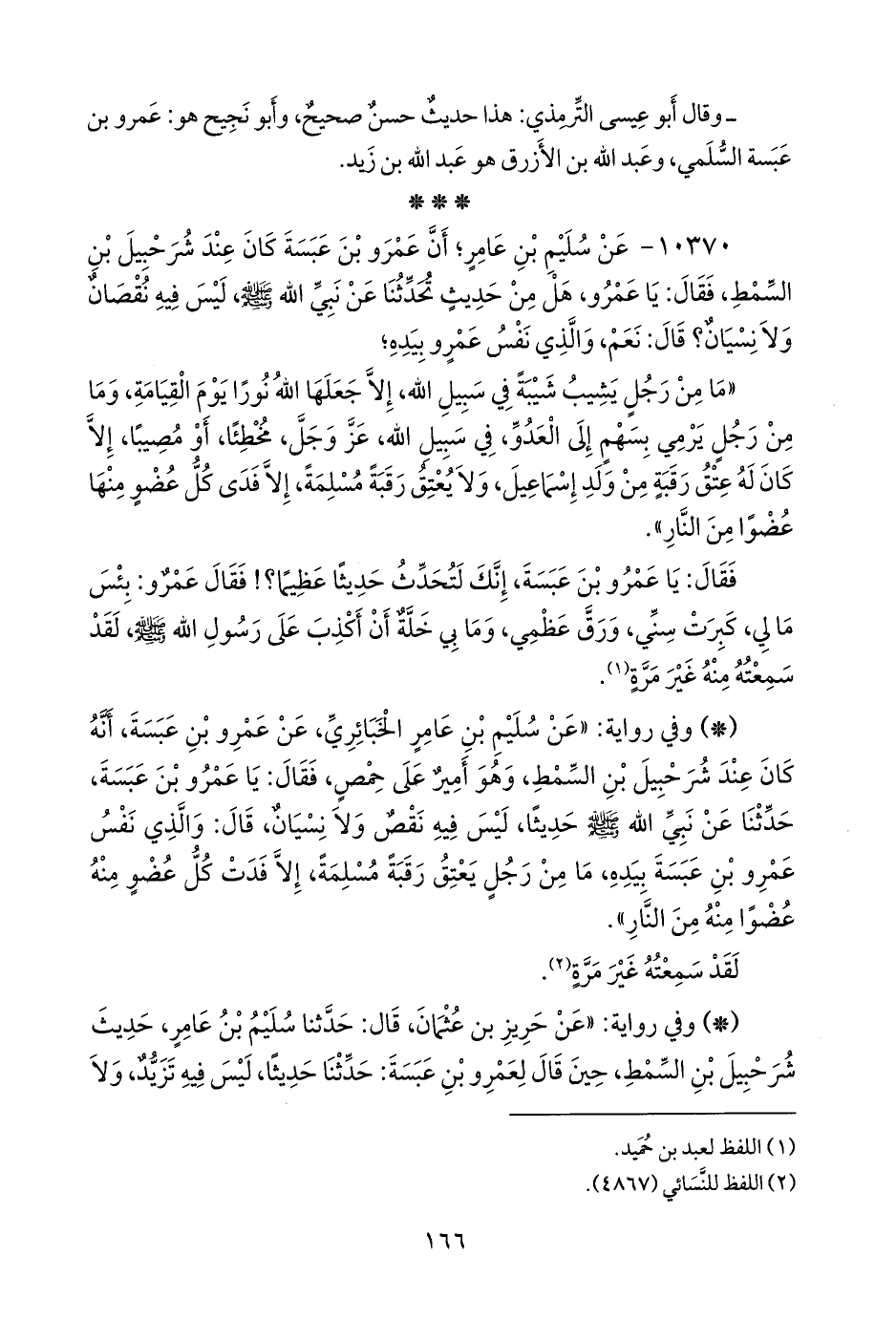 - وفي رواية: «عن سليم بن عامر الخبائري، عن عَمرو بن عبسة، أنه كان عند شُرحبيل بن السِّمْط، وهو أمير على حمص، فقال: يا عَمرو بن عبسة، حدثنا عن نبي الله صَلى الله عَليه وسَلم حديثا، ليس فيه نقص ولا نسيان، قال: والذي نفس عَمرو بن عبسة بيده، ما من رجل يعتق رقبة مسلمة، إلا فدت كل عضو منه عضوا منه من النار».
