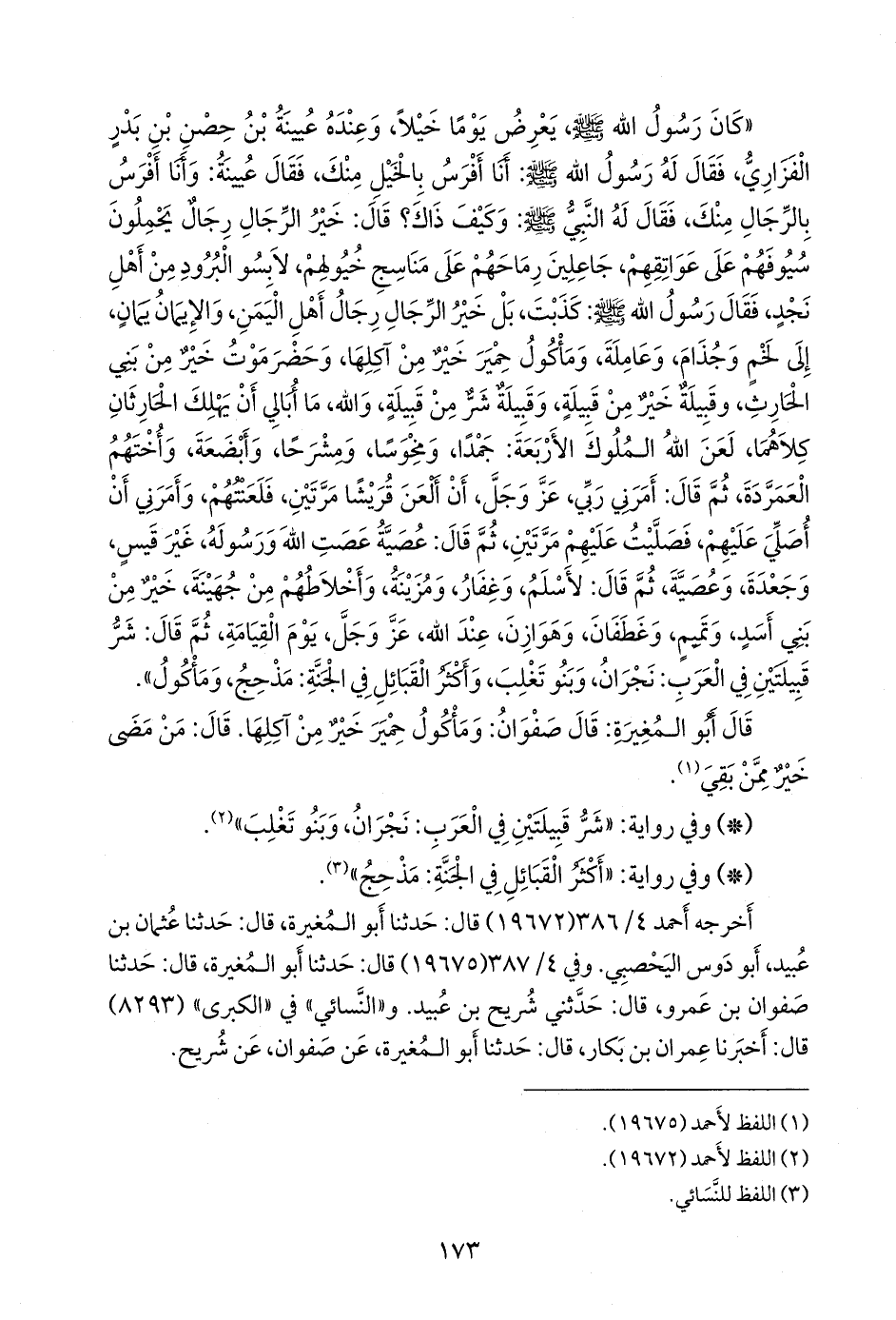 «بينا رسول الله صَلى الله عَليه وسَلم يعرض خيلا، وعنده عُيينة بن حصن بن حذيفة بن بدر الفزاري، فقال لعُيينة: أنا أبصر بالخيل منك، فقال عُيينة: وأنا أبصر بالرجال منك، قال: فكيف ذاك؟ قال: خيار الرجال الذين يضعون أسيافهم على عواتقهم، ويعرضون رماحهم على مناسج خيولهم، من أهل نجد، قال: كذبت، خيار الرجال رجال أهل اليمن، والإيمان يمان، وأكثر القبائل يوم القيامة في الجنة: مذحج، وحضرموت خير من بني الحارث، وما أبالي أن يهلك الحيان كلاهما، فلا قيل، ولا ملك إلا الله، عز وجل، لعن الله الملوك الأربعة: جمدا، ومشرحا، ومخوسا، وأبضعة، وأختهم العمردة».