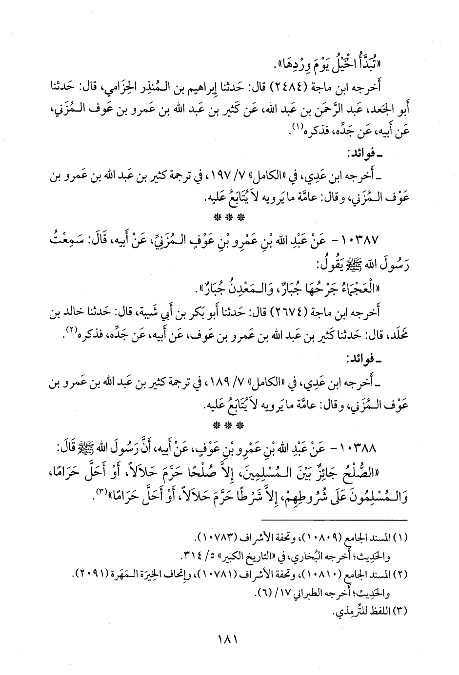 - وفي رواية: «الصلح جائز بين المسلمين، إلا صلحا حرم حلالا، أو أحل حراما».