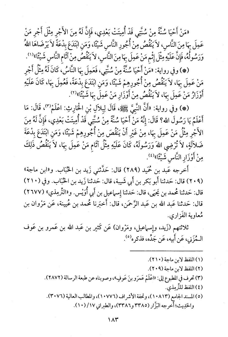 - وفي رواية: «أن النبي صَلى الله عَليه وسَلم قال لبلال بن الحارث: اعلم (¬١)، قال: ما أعلم يا رسول الله؟ قال: إنه من أحيا سنة من سنتي قد أميتت بعدي، فإن له من الأجر مثل من عمل بها، من غير أن ينقص من أجورهم شيئا، ومن ابتدع بدعة ضلالة، لا ترضي الله ورسوله، كان عليه مثل آثام من عمل بها، لا ينقص ذلك من أوزار الناس شيئا» (¬٢).