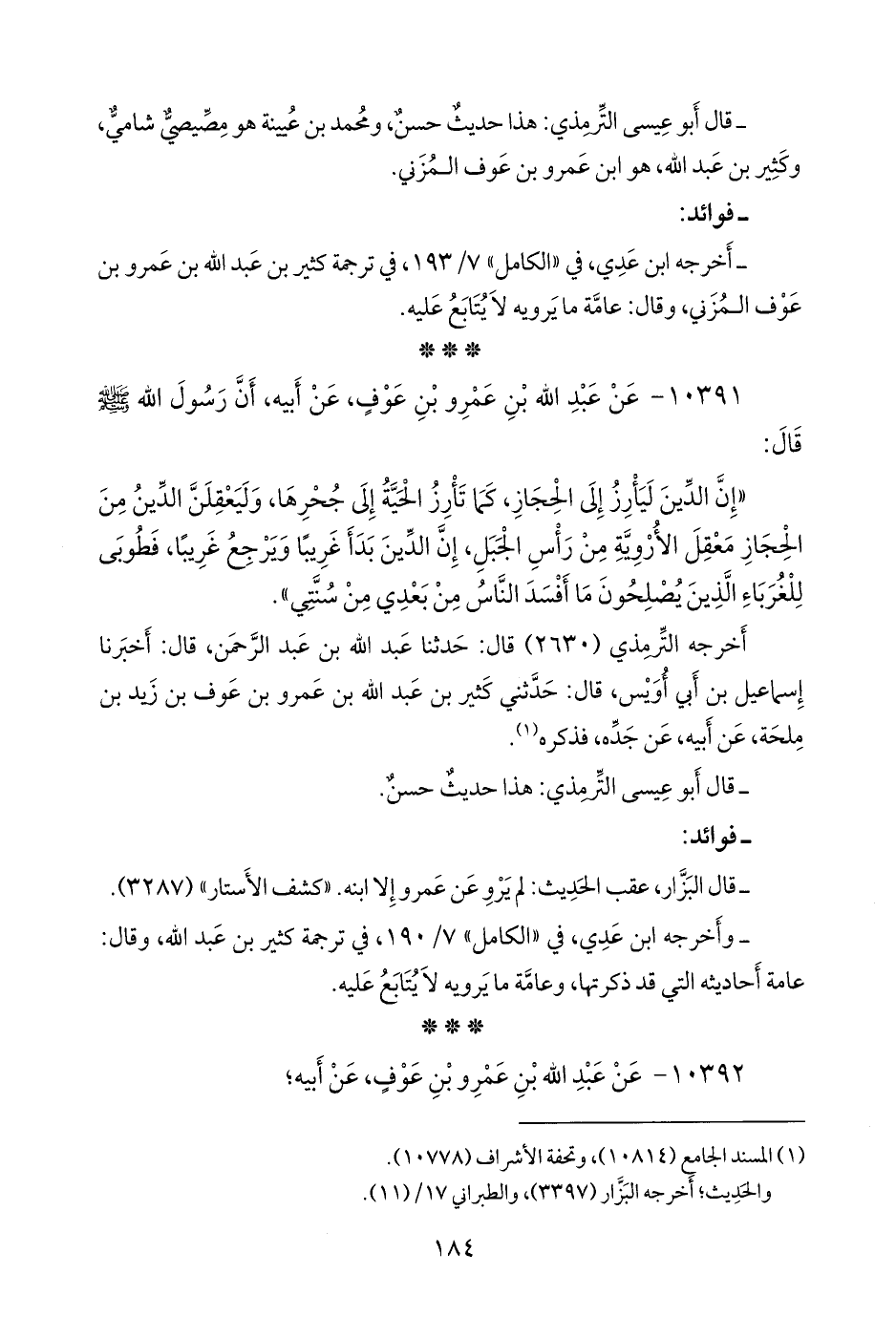 أخرجه التِّرمِذي (٢٦٣٠) قال: حدثنا عبد الله بن عبد الرَّحمَن، قال: أخبرنا إسماعيل بن أبي أويس، قال: حدثني كثير بن عبد الله بن عَمرو بن عوف بن زيد بن ملحة، عن أبيه، عن جَدِّه، فذكره (¬١).