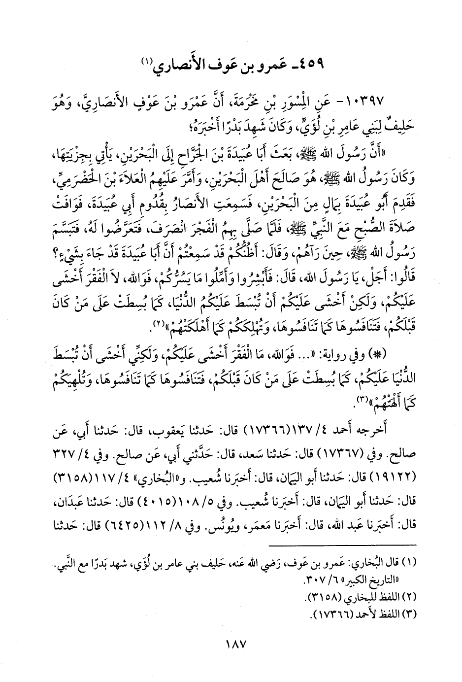 - وفي رواية: «عن المسور بن مخرمة، أَن عمرو بن عوف، وهو حليف بني عامر بن لؤي، وكان شهد بدرا مع رسول الله صَلى الله عَليه وسَلم أَخبره؛ أَن رسول الله صَلى الله عَليه وسَلم بعث أَبا عُبَيدة بن الجَراح إِلى البحرين، يأْتي بجزيتها، وكان رسول الله صَلى الله عَليه وسَلم هو صالح أَهل البحرين، وأَمر عليهم العلاءَ بن الحضرمي، فقدم أَبو عبيدة بمال من البحرين، فسمعت الأَنصار بقدومه، فوافت صلاة الفجر مع رسول الله صَلى الله عَليه وسَلم فلما صلى رسول الله صَلى الله عَليه وسَلم صلاة الفجر انصرف، فتعرضوا له، فتبسم رسول الله صَلى الله عَليه وسَلم حين رآهم، فقال: أَظنكم قد سمعتم أَن أَبا عبيدة قد جاءَ، وجاءَ بشيءٍ؟ قالوا: أَجل يا رسول الله، قال: فأَبشروا وأَملوا ما يسركم، فوالله ما الفقر أَخشى عليكم، ولكن أَخشى أَن تبسط الدنيا عليكم، كما بسطت على من كان قبلكم، فتنافسوها كما تنافسوها، وتلهيكم كما أَلهتهم» (¬٣).