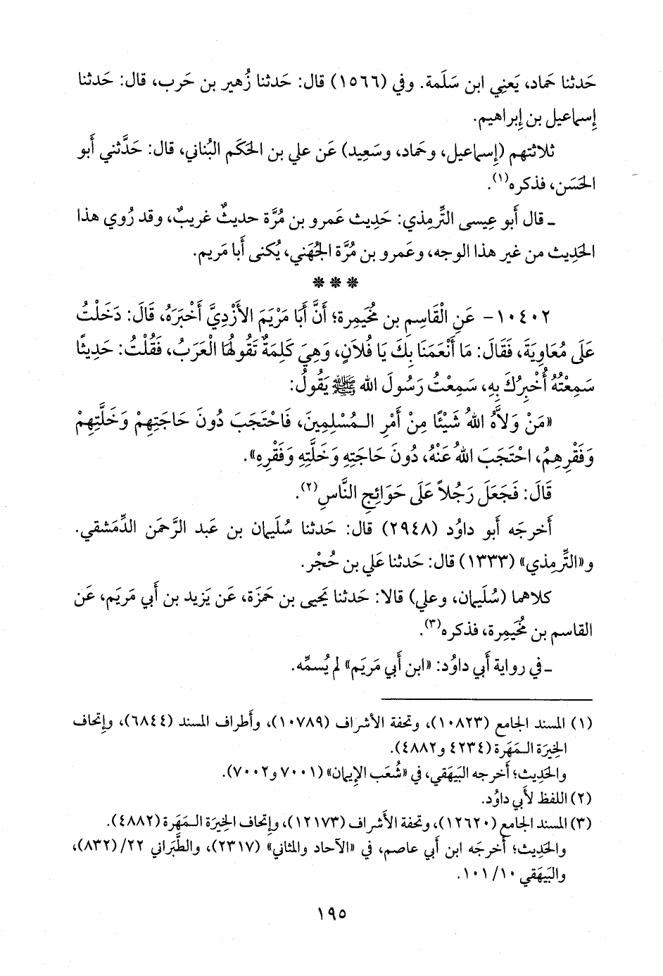 ١٠٤٠٢ - عن القاسم بن مُخَيمِرة؛ أن أبا مريم الأزدي أخبره، قال: دخلت على معاوية، فقال: ما أنعمنا بك يا فلان، وهي كلمة تقولها العرب، فقلت: حديثا سمعته أخبرك به، سمعت رسول الله صَلى الله عَليه وسَلم يقول: