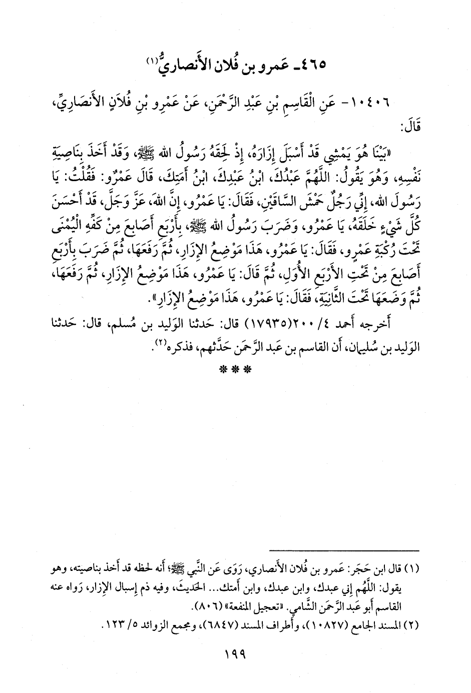 (¬١) قال ابن حجر: عَمرو بن فلان الأَنصاري، روى عن النبي صَلى الله عَليه وسَلم؛ أنه لحظه قد أخذ بناصيته، وهو يقول: اللهم إني عبدك، وابن عبدك، وابن أمتك، الحديث، وفيه ذم إسبال الإزار، رواه عنه القاسم أَبو عبد الرَّحمَن الشامي. «تعجيل المنفعة» (٨٠٦).