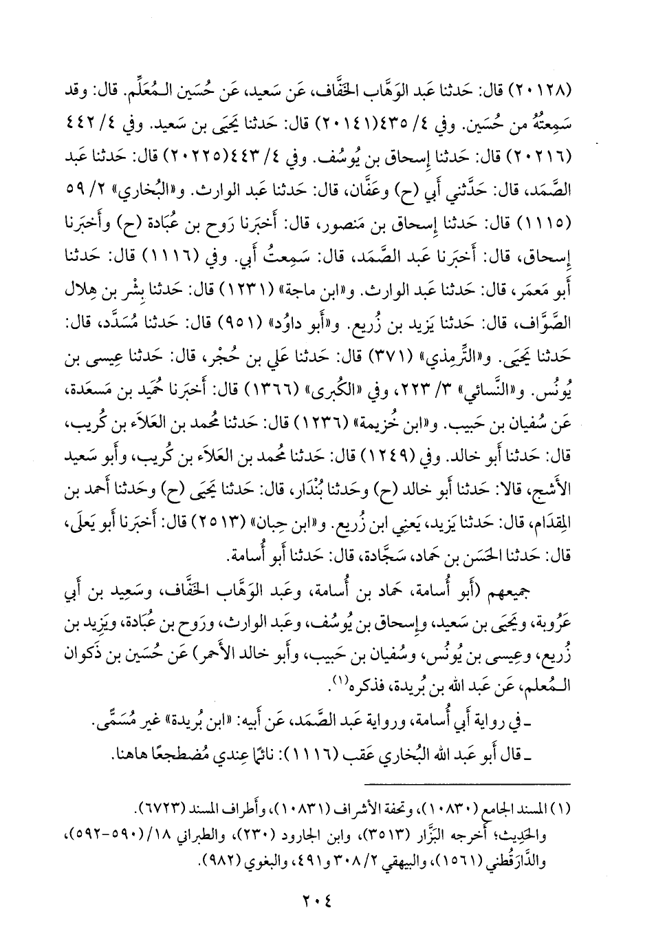جميعهم (أَبو أُسامة حماد بن أُسامة، وعبد الوَهَّاب الخفاف، وسعيد بن أبي عَروبَة، ويحيى بن سعيد، وإسحاق بن يوسف، وعبد الوارث، وروح بن عبادة، ويزيد بن زُريع، وعيسى بن يونس، وسفيان بن حبيب، وأَبو خالد الأحمر) عن حسين بن ذكوان المعلم، عن عبد الله بن بُريدة، فذكره (¬١).