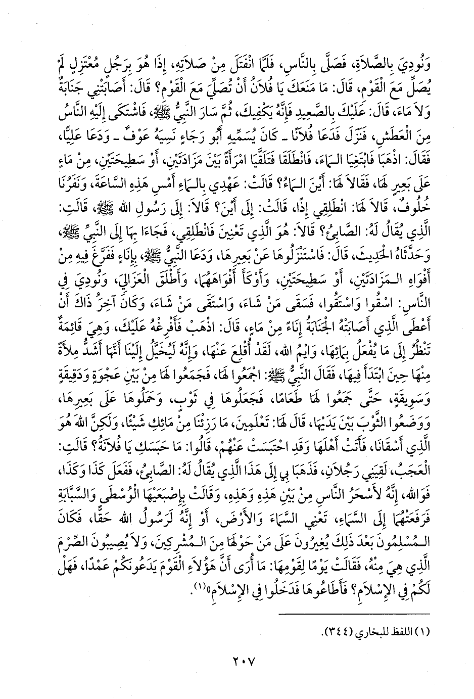 وكان آخر ذاك أن أعطى الذي أصابته الجنابة إناء من ماء، قال: اذهب فأفرغه عليك، وهي قائمة تنظر إلى ما يفعل بمائها، وايم الله، لقد أقلع عنها، وإنه ليخيل إلينا أنها أشد ملأة منها حين ابتدأ فيها، فقال النبي صَلى الله عَليه وسَلم: اجمعوا لها، فجمعوا لها من بين عجوة ودقيقة وسويقة، حتى جمعوا لها طعاما، فجعلوها في ثوب، وحملوها على بعيرها، ووضعوا الثوب بين يديها، قال لها: تعلمين، ما رزئنا من مائك شيئا، ولكن الله هو الذي أسقانا، فأتت أهلها وقد احتبست عنهم، قالوا: ما حبسك يا فلانة؟ قالت: العجب، لقيني رجلان، فذهبا بي إلى هذا الذي يقال له: الصابئ، ففعل كذا وكذا، فوالله، إنه لأسحر الناس من بين هذه وهذه، وقالت بإصبعيها الوسطى والسبابة فرفعتهما إلى السماء، تعني السماء والأرض، أو إنه لرسول الله حقا، فكان المسلمون بعد ذلك يغيرون على من حولها من المشركين، ولا يصيبون الصرم الذي هي منه، فقالت يوما لقومها: ما أرى أن هؤلاء القوم يدعونكم عمدا، فهل لكم في الإسلام؟ فأطاعوها فدخلوا في الإسلام» (¬١).