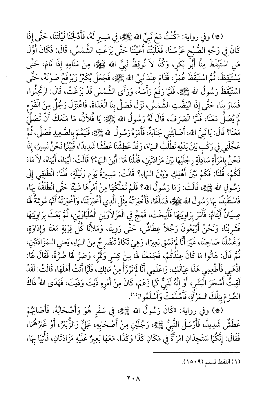 - وفي رواية: «كان رسول الله صَلى الله عَليه وسَلم في سفر هو وأصحابه، فأصابهم عطش شديد، فأرسل النبي صَلى الله عَليه وسَلم رجلين من أصحابه، علي والزبير، أو غيرهما، فقال: إنكما ستجدان امرأة في مكان كذا وكذا، معها بعير عليه مزادتان، فأتيا بها،