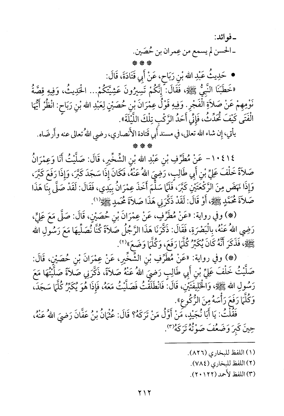 - وفي رواية: «عن مطرف بن الشخير، عن عمران بن حصين، قال: صليت خلف علي بن أبي طالب رضي الله عنه صلاة، ذكرني صلاة صليتها مع رسول الله صَلى الله عَليه وسَلم والخليفتين، قال: فانطلقت فصليت معه، فإذا هو يكبر كلما سجد، وكلما رفع رأسه من الركوع».