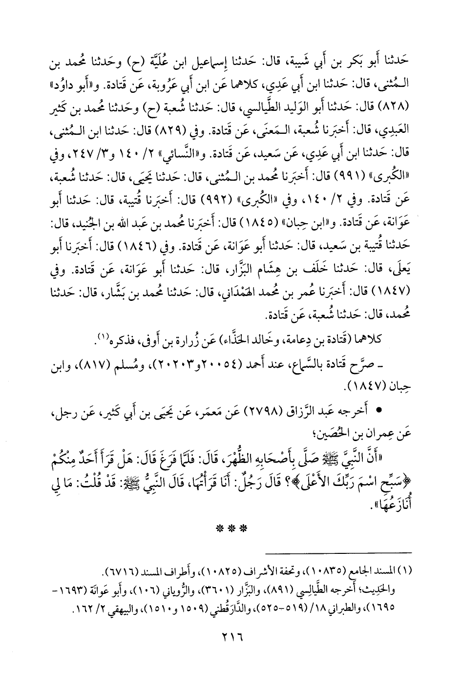 و «أَبو داود» (٨٢٨) قال: حدثنا أَبو الوليد الطيالسي، قال: حدثنا شعبة (ح) وحدثنا محمد بن كثير العبدي، قال: أخبرنا شعبة، المَعنَى، عن قتادة. وفي (٨٢٩) قال: حدثنا ابن المثنى، قال: حدثنا ابن أَبي عَدي، عن سعيد، عن قتادة. و «النَّسَائي» ٢/ ١٤٠ و ٣/ ٢٤٧، وفي «الكبرى» (٩٩١) قال: أخبرنا محمد بن المثنى، قال: حدثنا يحيى، قال: حدثنا شعبة، عن قتادة. وفي ٢/ ١٤٠، وفي «الكبرى» (٩٩٢) قال: أخبرنا قتيبة، قال: حدثنا أَبو عَوانة، عن قتادة. و «ابن حِبَّان» (١٨٤٥) قال: أخبرنا محمد بن عبد الله بن الجنيد، قال: حدثنا قتيبة بن سعيد، قال: حدثنا أَبو عَوانة، عن قتادة. وفي (١٨٤٦) قال: أخبرنا أَبو يَعلى، قال: حدثنا خلف بن هشام البزار، قال: حدثنا أَبو عَوانة، عن قتادة. وفي (١٨٤٧) قال: أخبرنا عمر بن محمد الهمداني، قال: حدثنا محمد بن بشار، قال: حدثنا محمد، قال: حدثنا شعبة، عن قتادة.