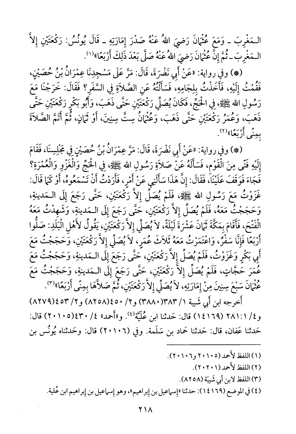 - وفي رواية: «عن أبي نضرة، قال: مر عمران بن حصين في مجلسنا، فقام إليه فتى من القوم، فسأله عن صلاة رسول الله صَلى الله عَليه وسَلم في الحج والغزو والعمرة؟ فجاء فوقف علينا، فقال: إن هذا سألني عن أمر، فأردت أن تسمعوه، أو كما قال: غزوت مع رسول الله صَلى الله عَليه وسَلم فلم يصل إلا ركعتين، حتى رجع إلى المدينة، وحججت معه، فلم يصل إلا ركعتين، حتى رجع إلى المدينة، وشهدت معه الفتح، فأقام بمكة ثمان عشرة ليلة، لا يصلي إلا ركعتين، يقول لأهل البلد: صلوا أربعا فإنا سفر، واعتمرت معه ثلاث عمر، لا يصلي إلا ركعتين، وحججت مع أَبي بكر وغزوت، فلم يصل إلا ركعتين، حتى رجع إلى المدينة، وحججت مع عمر حجات، فلم يصل إلا ركعتين، حتى رجع إلى المدينة، وحججت مع عثمان سبع سنين من إمارته، لا يصلي إلا ركعتين، ثم صلاها بمنى أربعا» (¬١).