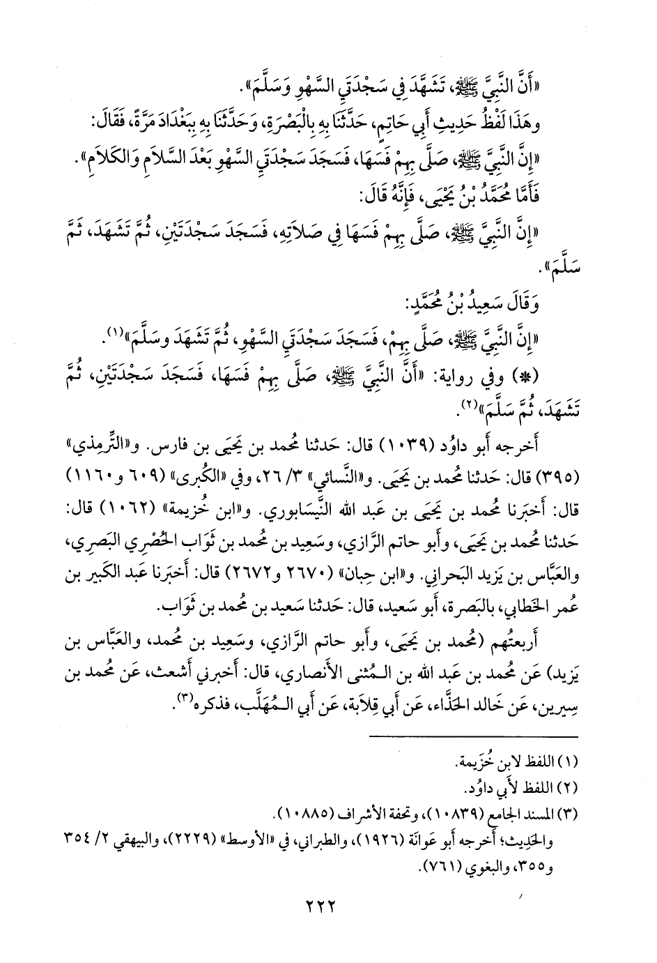 و «ابن خزيمة» (١٠٦٢) قال: حدثنا محمد بن يحيى، وأَبو حاتم الرازي، وسعيد بن محمد بن ثواب الحصري البصري، والعباس بن يزيد البحراني. و «ابن حِبَّان» (٢٦٧٠ و ٢٦٧٢) قال: أخبرنا عبد الكبير بن عمر الخطابي، بالبصرة، أَبو سعيد، قال: حدثنا سعيد بن محمد بن ثواب.
