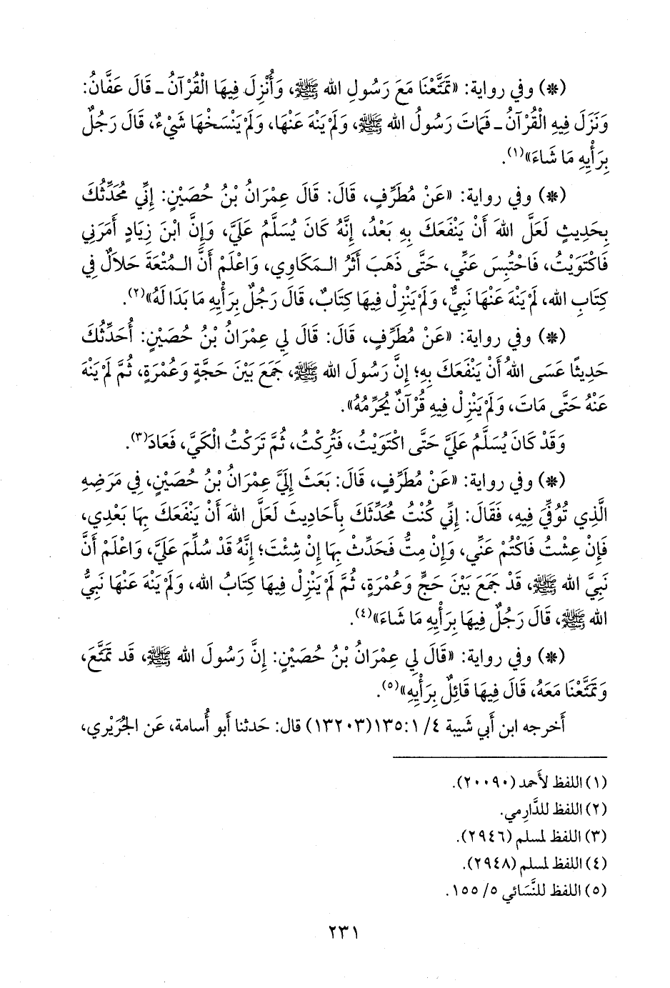 - وفي رواية: «عن مطرف، قال: بعث إلي عمران بن حصين، في مرضه الذي توفي فيه، فقال: إني كنت محدثك بأحاديث لعل الله أن ينفعك بها بعدي، فإن عشت فاكتم عني، وإن مت فحدث بها إن شئت؛ إنه قد سلم علي، واعلم أن نبي الله صَلى الله عَليه وسَلم قد جمع بين حج وعمرة، ثم لم ينزل فيها كتاب الله، ولم ينه عنها نبي الله صَلى الله عَليه وسَلم قال رجل فيها برأيه ما شاء» (¬٢).