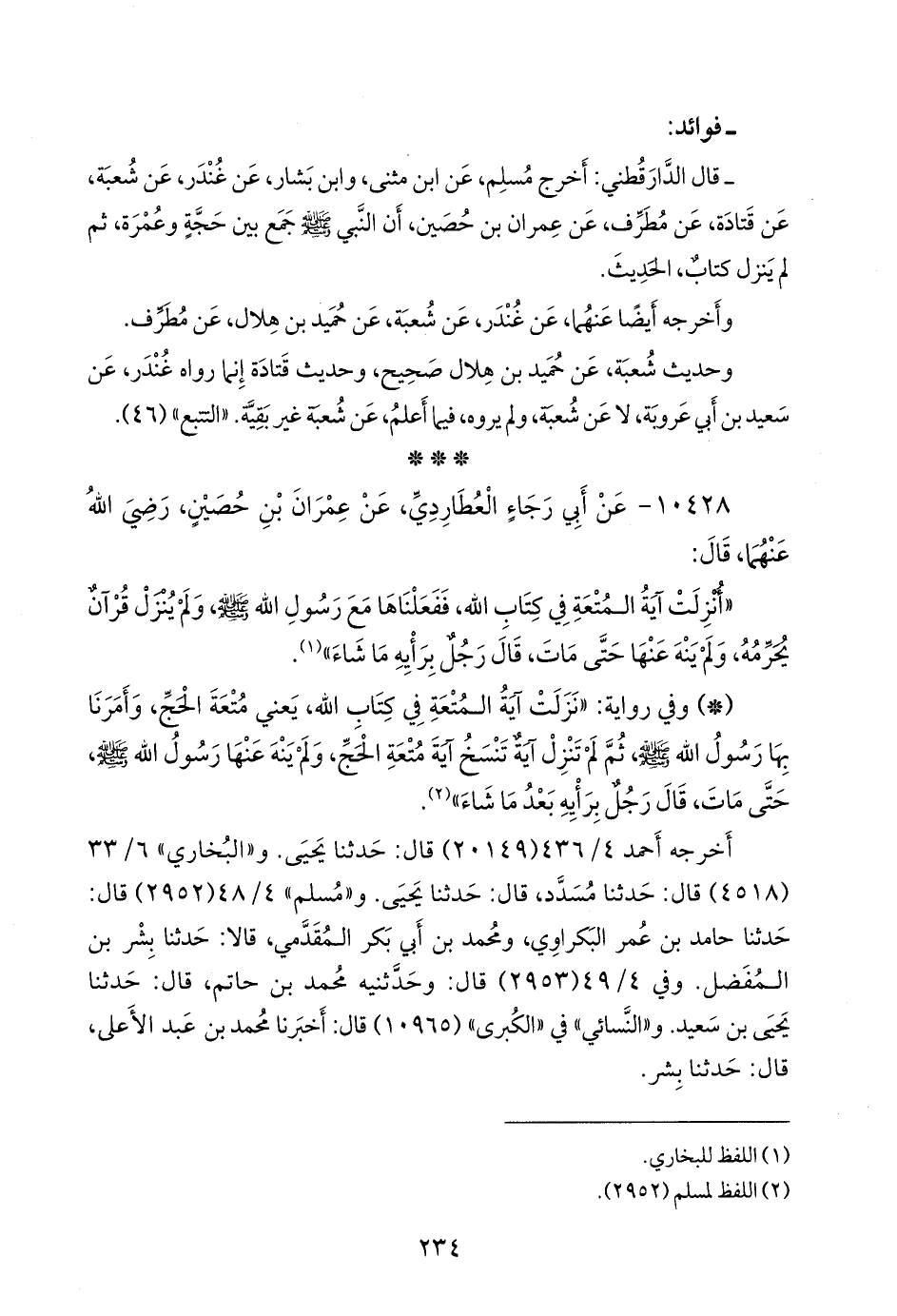 - قال الدارقُطني: أخرج مسلم، عن ابن مثنى، وابن بشار، عن غُندَر، عن شعبة، عن قتادة، عن مطرف، عن عمران بن حصين، أن النبي صَلى الله عَليه وسَلم جمع بين حجة وعمرة، ثم لم ينزل كتاب، الحديث.