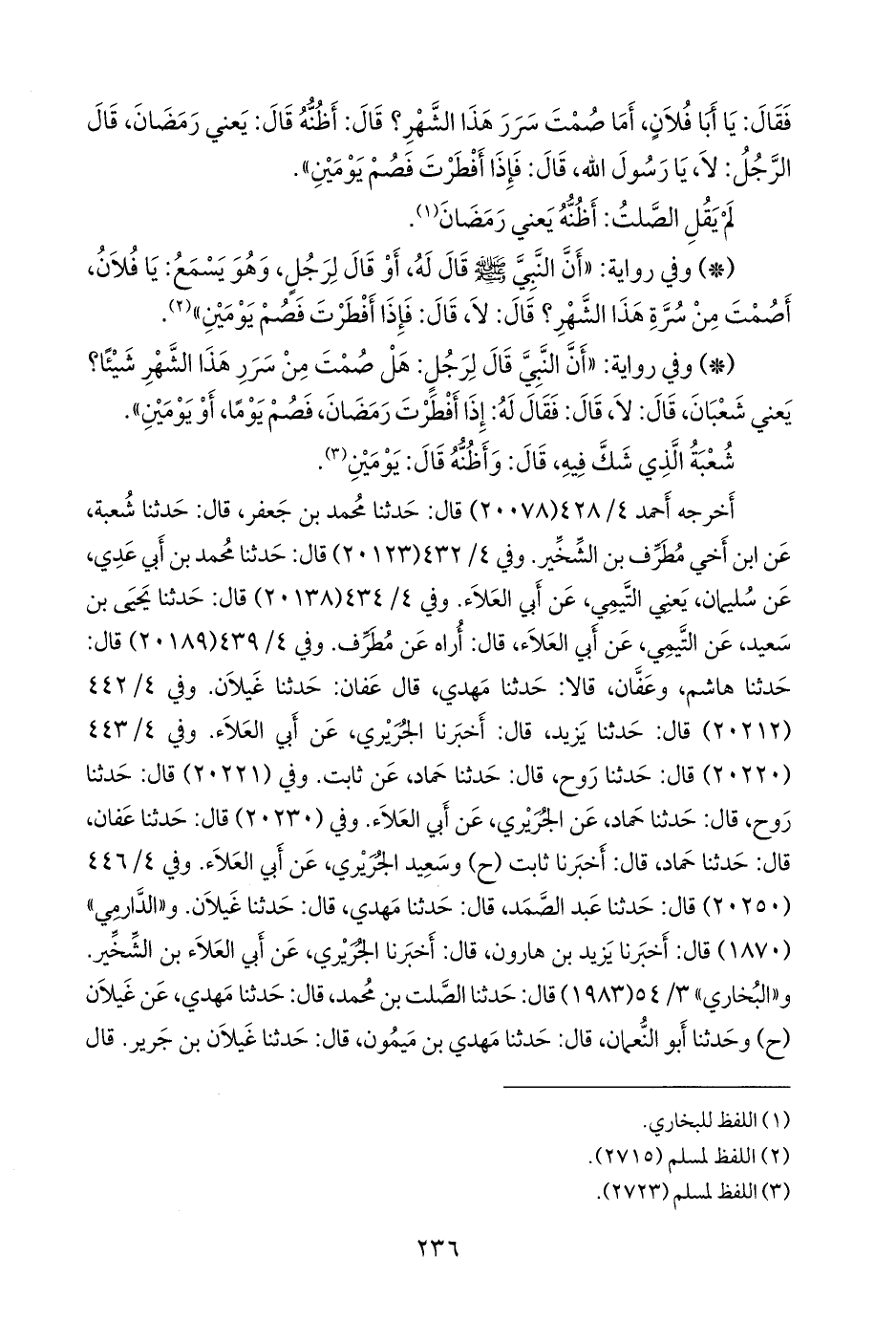 أَبو عبد الله البخاري عقبه: وقال ثابت، عن مطرف، عن عمران، عن النبي صَلى الله عَليه وسَلم؛ من سرر شعبان. و «مسلم» ٣/ ١٦٦ (٢٧١٥) قال: حدثني عبد الله بن محمد بن أسماء الضبعي، قال: حدثنا مهدي، وهو ابن ميمون، قال: حدثنا غَيلان بن جرير. وفي ٣/ ١٦٨ (٢٧٢١) قال: حدثنا هداب بن خالد، قال: حدثنا حماد بن سلمة، عن ثابت. وفي (٢٧٢٢) قال: وحدثنا أَبو بكر بن أبي شيبة، قال: حدثنا يزيد بن هارون، عن الجُريري، عن أبي العلاء.