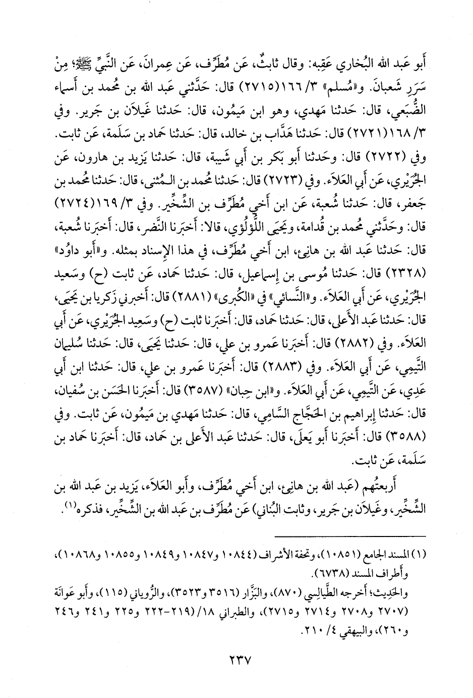 وفي (٢٧٢٣) قال: حدثنا محمد بن المثنى، قال: حدثنا محمد بن جعفر، قال: حدثنا شعبة، عن ابن أخي مطرف بن الشخير. وفي ٣/ ١٦٩ (٢٧٢٤) قال: وحدثني محمد بن قُدَامة، ويحيى اللؤلؤي، قالا: أخبرنا النضر، قال: أخبرنا شعبة، قال: حدثنا عبد الله بن هانئ، ابن أخي مطرف، في هذا الإسناد بمثله. و «أَبو داود» (٢٣٢٨) قال: حدثنا موسى بن إسماعيل، قال: حدثنا حماد، عن ثابت (ح) وسعيد الجُريري، عن أبي العلاء. و «النَّسَائي» في «الكبرى» (٢٨٨١) قال: أخبرني زكريا بن يحيى، قال: حدثنا عبد الأعلى، قال: حدثنا حماد، قال: أخبرنا ثابت (ح) وسعيد الجُريري، عن أبي العلاء. وفي (٢٨٨٢) قال: أخبرنا عَمرو بن علي، قال: حدثنا يحيى، قال: حدثنا سليمان التيمي، عن أبي العلاء. وفي (٢٨٨٣) قال: أخبرنا عَمرو بن علي، قال: حدثنا ابن أَبي عَدي، عن التيمي، عن أبي العلاء. و «ابن حِبَّان» (٣٥٨٧) قال: أخبرنا الحسن بن سفيان، قال: حدثنا إبراهيم بن الحجاج السامي، قال: حدثنا مهدي بن ميمون، عن ثابت. وفي (٣٥٨٨) قال: أخبرنا أَبو يَعلى، قال: حدثنا عبد الأعلى بن حماد، قال: أخبرنا حماد بن سلمة، عن ثابت.
