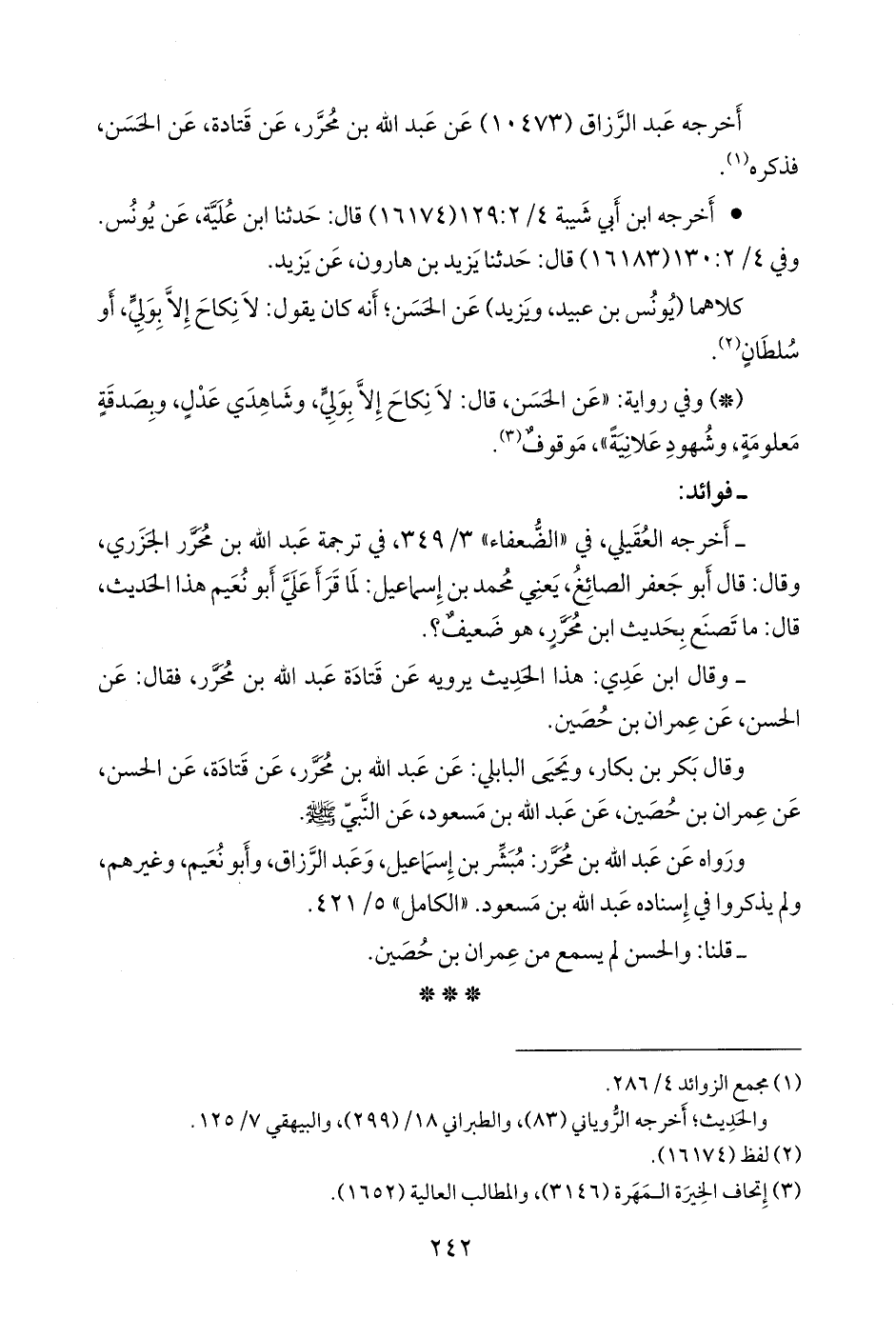- وقال ابن عَدي: هذا الحديث يرويه عن قتادة عبد الله بن مُحَرَّر، فقال: عن الحسن، عن عمران بن حصين.