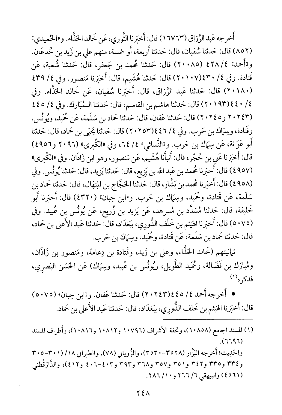 ثمانيتهم (خالد الحَذَّاء، وعلي بن زيد، وقتادة بن دعامة، ومنصور بن زاذان، ومبارك بن فضالة، وحميد الطويل، ويونس بن عبيد، وسماك) عن الحسن البصري، فذكره (¬١).